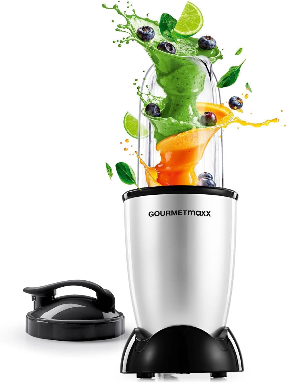 • Приготвяне за секунди: чао, обемист кухненски робот! Ето го компактният кухненски универсален уред за вашия дневен прием на витамини. Защото с GOURMETmaxx Mr. Magic в комплект от 18 части можете бързо да пасирате и смилате храна и напитки. Идеален е и като чопър, а с функция за сокоизстисквачка.