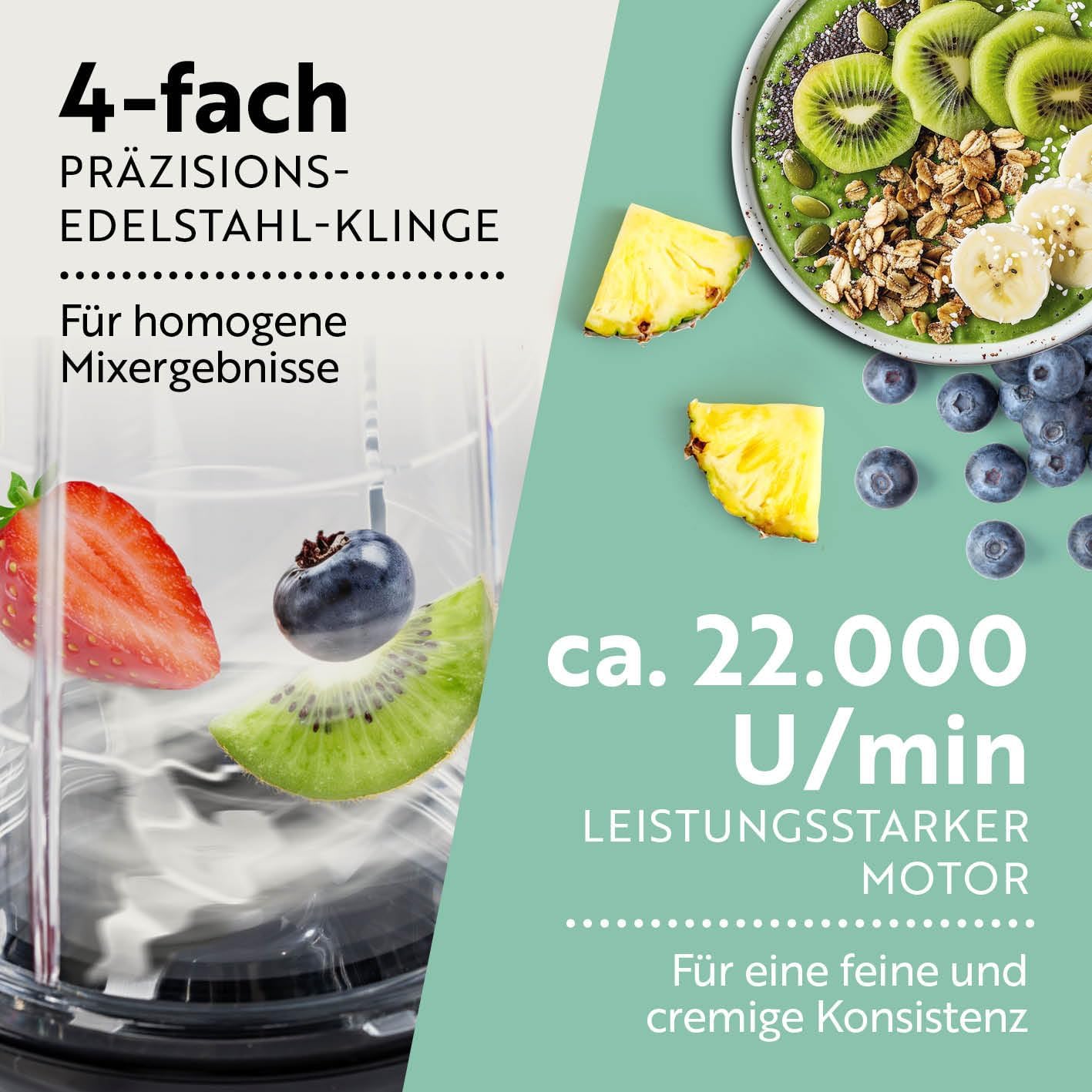 • Лесен за употреба: блендерът е за плодове, зеленчуци и др. Размери (В x Ш) приблизително 37x17,5 см. Това го прави подходящ дори за малка кухня. Управлението е супер практично: просто завъртете приставката, разбъркайте - готово! След това малкият миксер може лесно да се почисти и прибере.