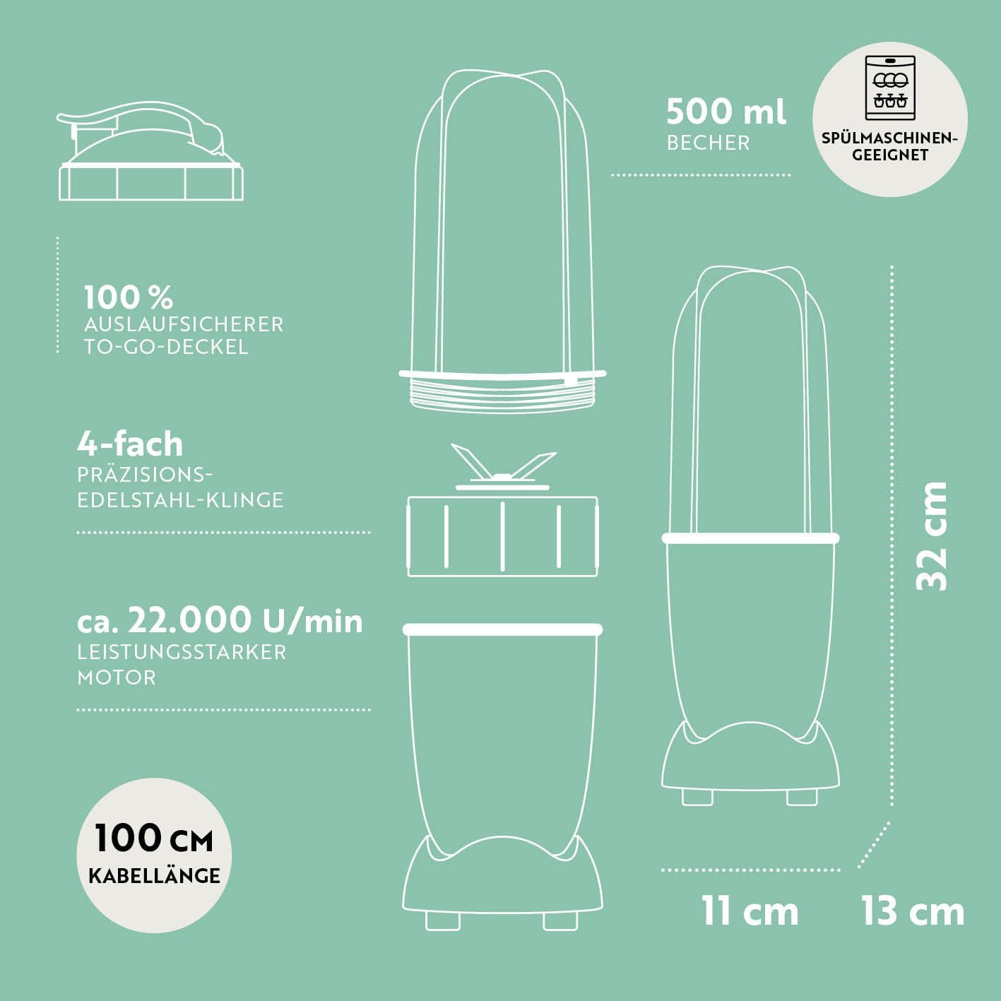 • Лесен за употреба: блендерът е за плодове, зеленчуци и др. Размери (В x Ш) приблизително 37x17,5 см. Това го прави подходящ дори за малка кухня. Управлението е супер практично: просто завъртете приставката, разбъркайте - готово! След това малкият миксер може лесно да се почисти и прибере.