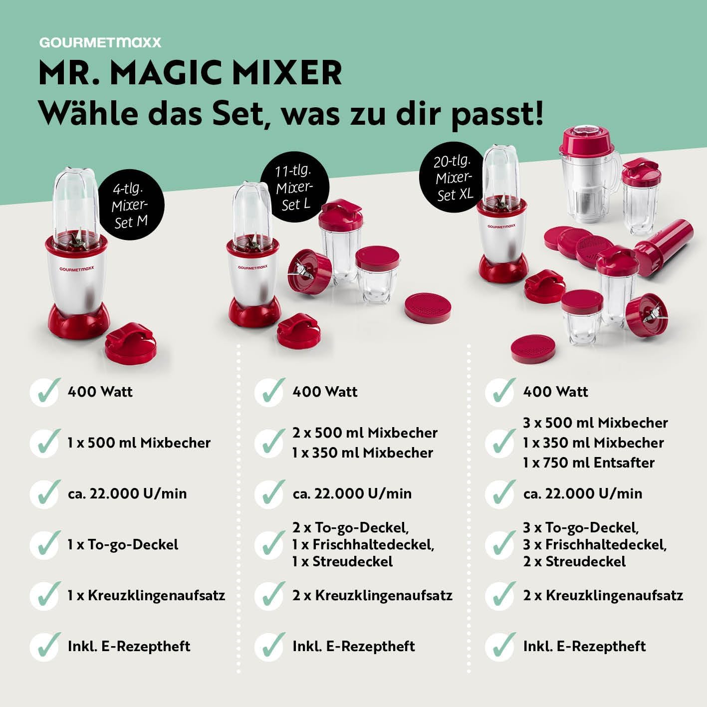 • XXL комплект: комплект от 18 части. Пакетът с аксесоари се състои от практичния мини шейкър и 2 приставки за остриета. Отгоре има 2 различни капака за нарязани ядки, билки и др., херметически затворени капаци и 5 различни чаши за смесване, които правят Mr. Make magic универсален помощник във вашата кухня.