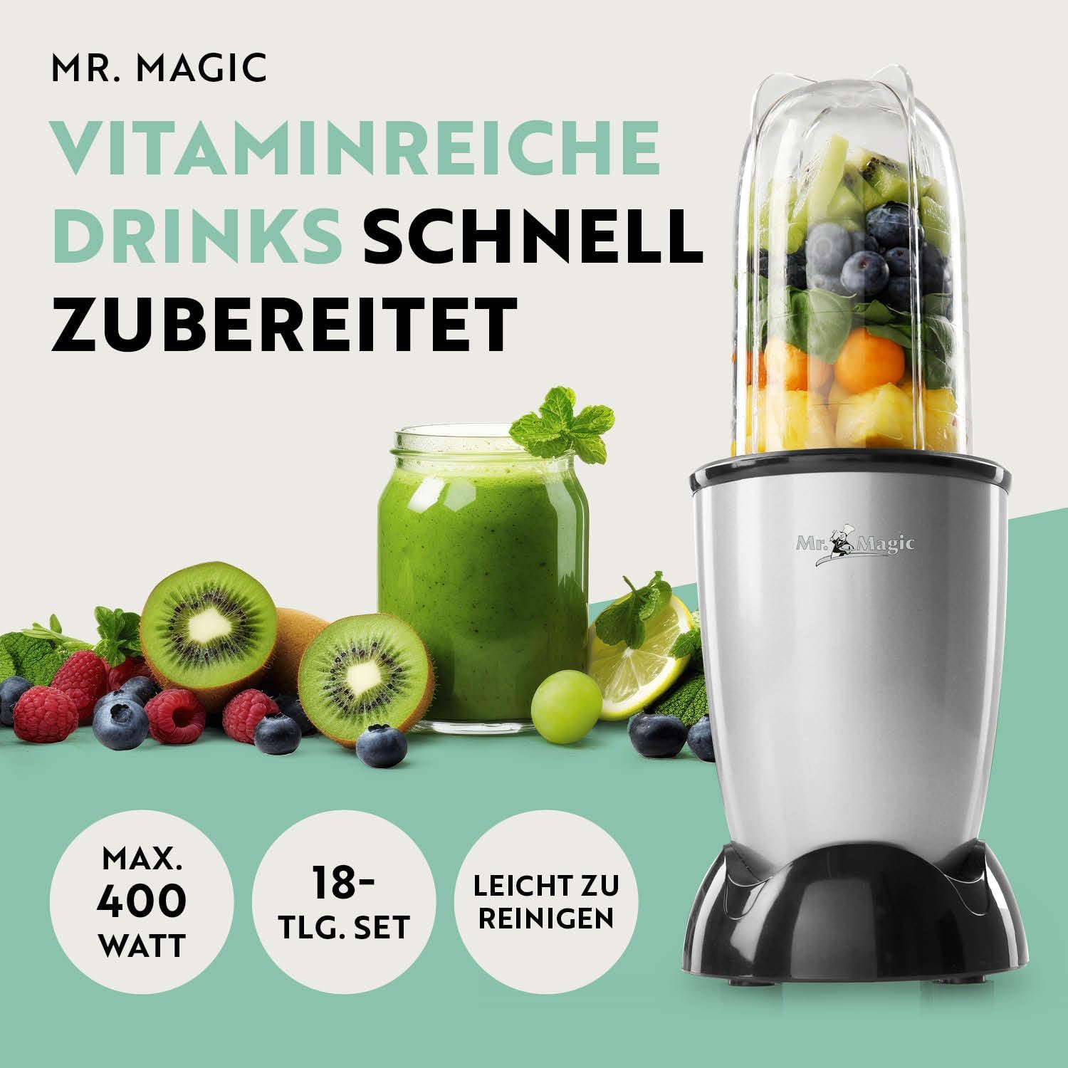 • Приготвяне за секунди: чао, обемист кухненски робот! Ето го компактният кухненски универсален уред за вашия дневен прием на витамини. Защото с GOURMETmaxx Mr. Magic в комплект от 18 части можете бързо да пасирате и смилате храна и напитки. Идеален е и като чопър, а с функция за сокоизстисквачка.