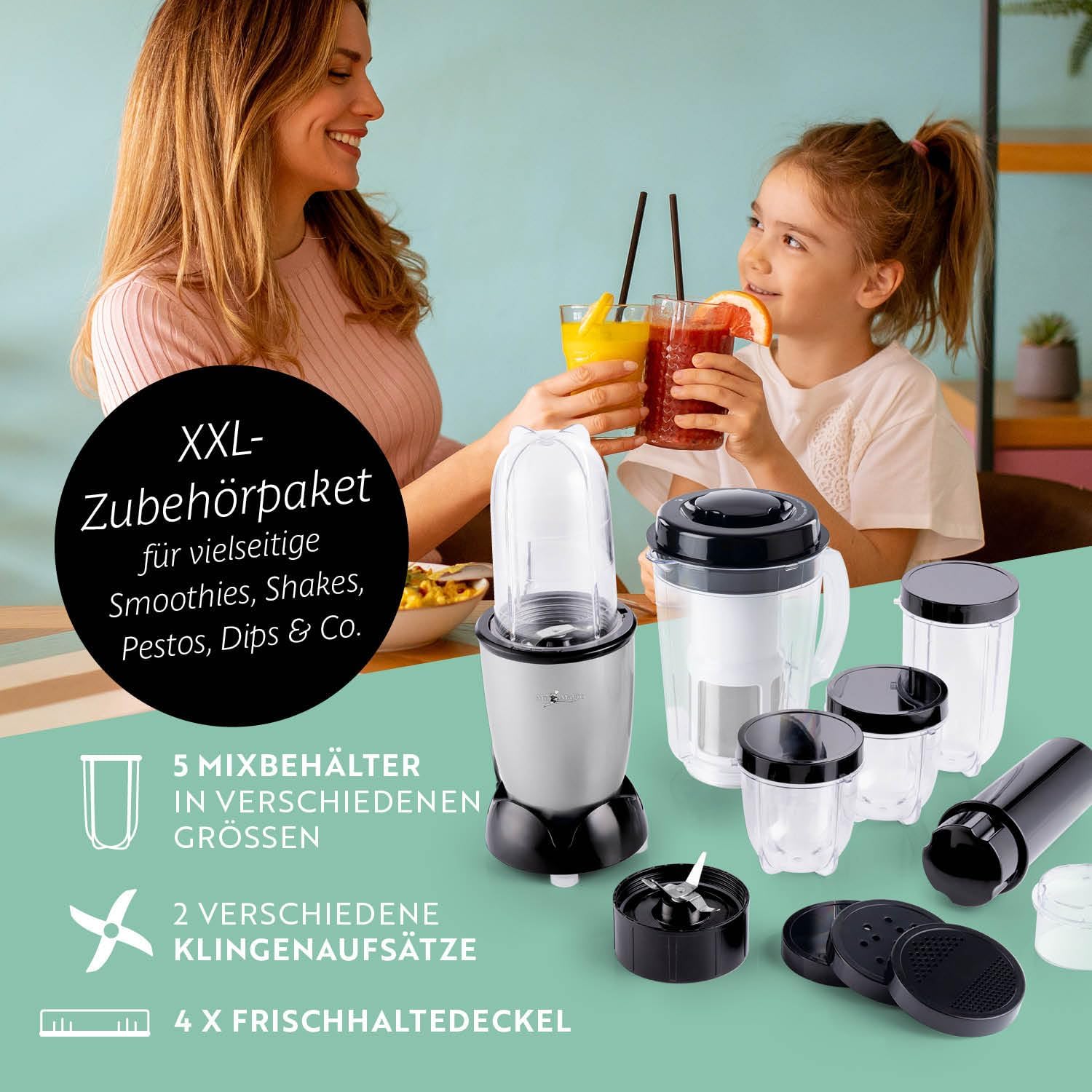GOURMETmaxx Mr. Magic Mixer, машина за смутита с XXL пакет аксесоари, стационарен миксер, 18 части, блендер с капаци за съхранение на храна, кухненски робот за шейкове, смутита и др.