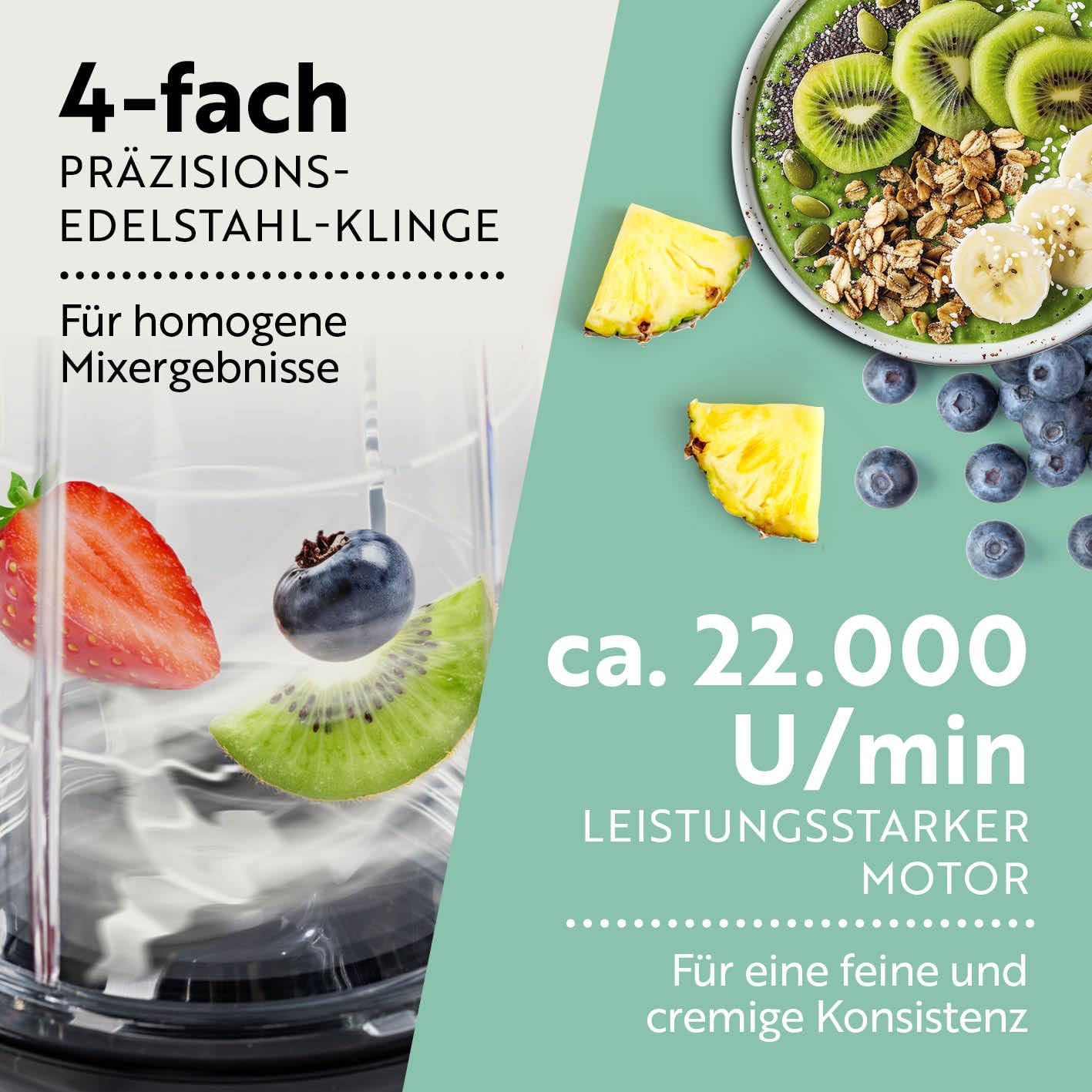 • Вашият ежедневен свеж заряд: креативни смутита, шейкове, коктейли, дипове и др. Наслаждавате се на всеки ден? Универсалният мултичопър е подходящ за почти всички кухненски идеи. Можете дори да приготвяте студени сосове и нарязани ядки с високопроизводителния миксер (не е подходящ за кубчета лед).