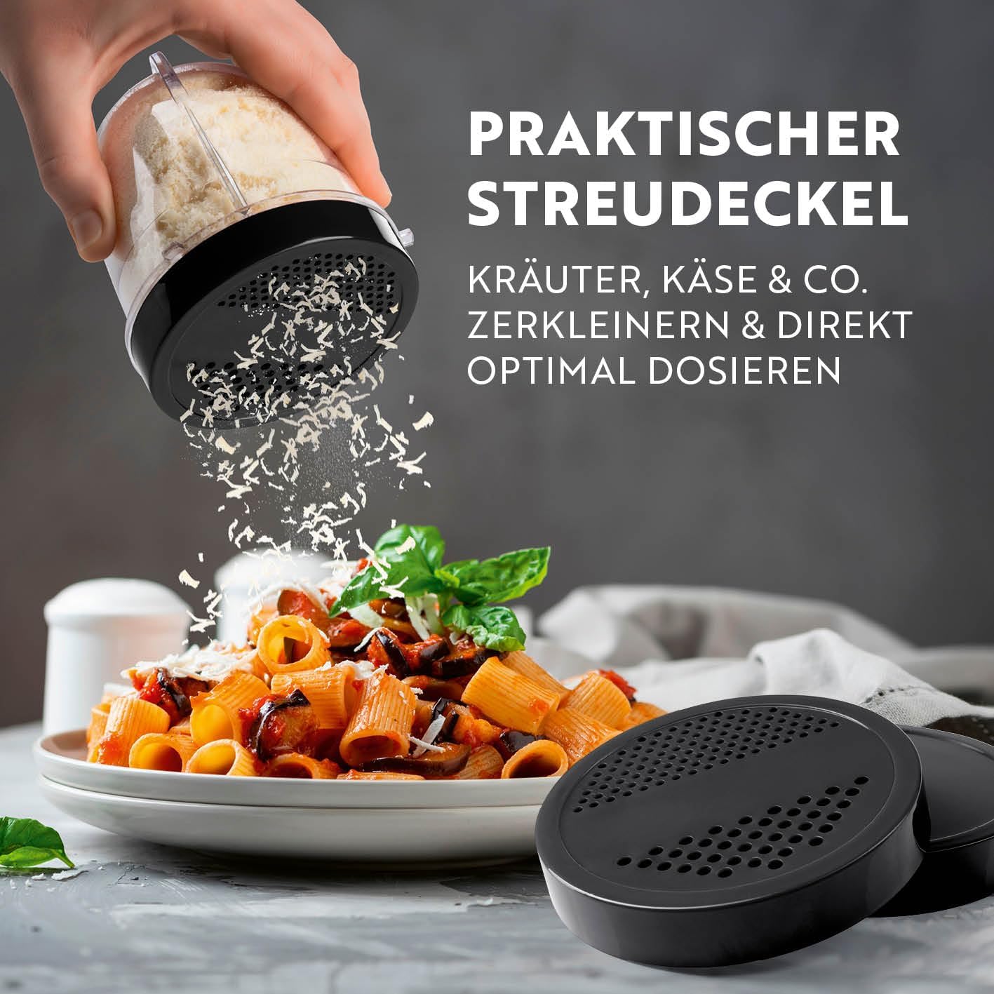 • Приготвяне за секунди: чао, обемист кухненски робот! Ето го компактният кухненски универсален уред за вашия дневен прием на витамини. Защото с GOURMETmaxx Mr. Magic в комплект от 18 части можете бързо да пасирате и смилате храна и напитки. Идеален е и като чопър, а с функция за сокоизстисквачка.