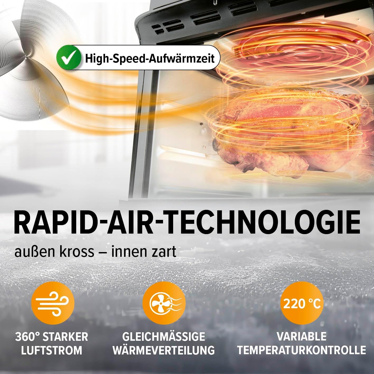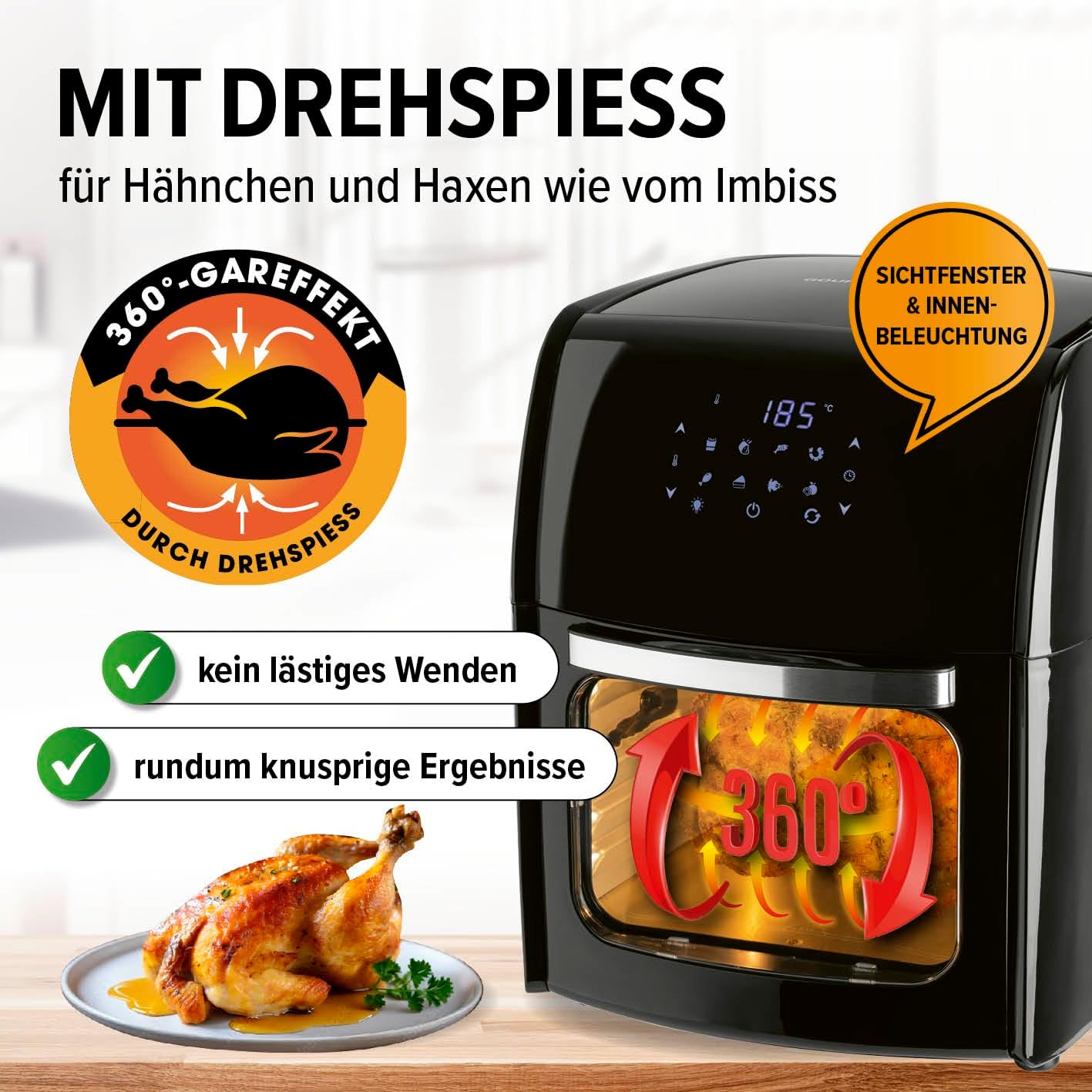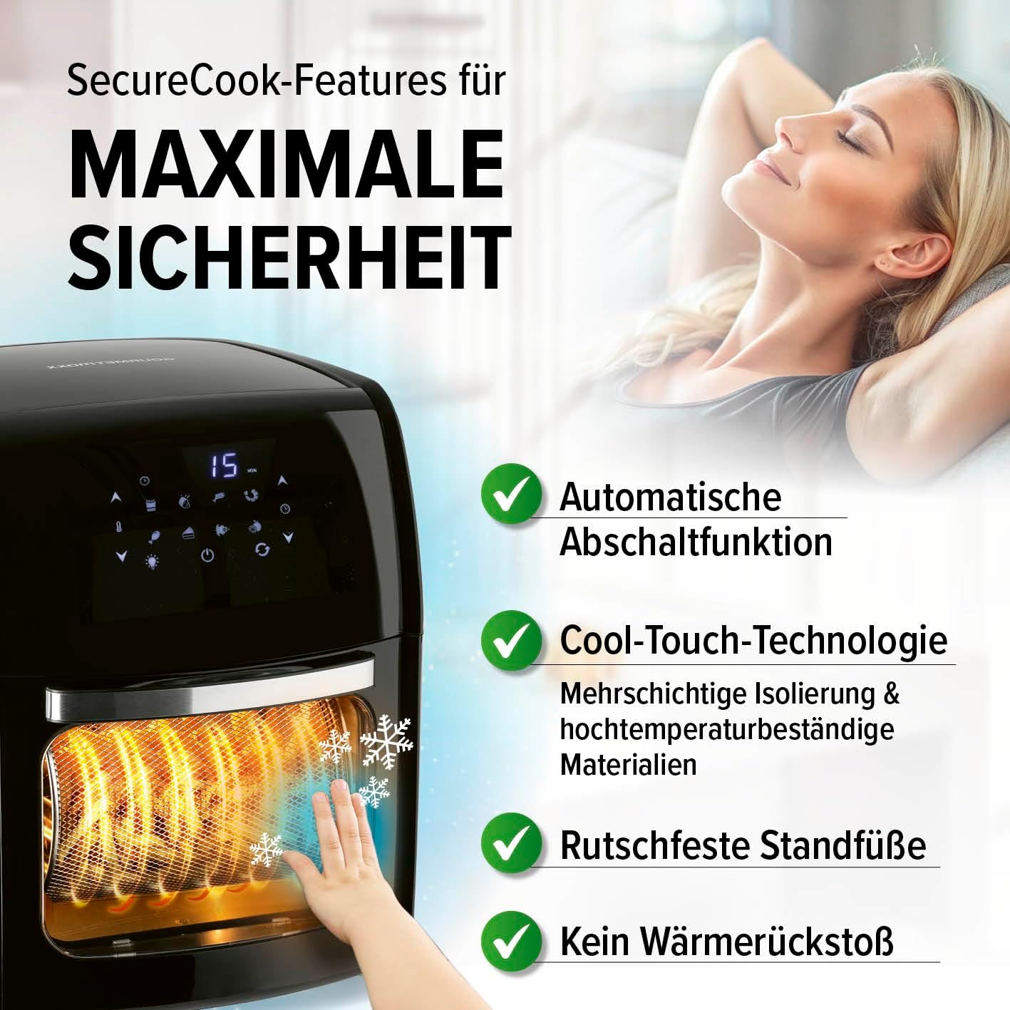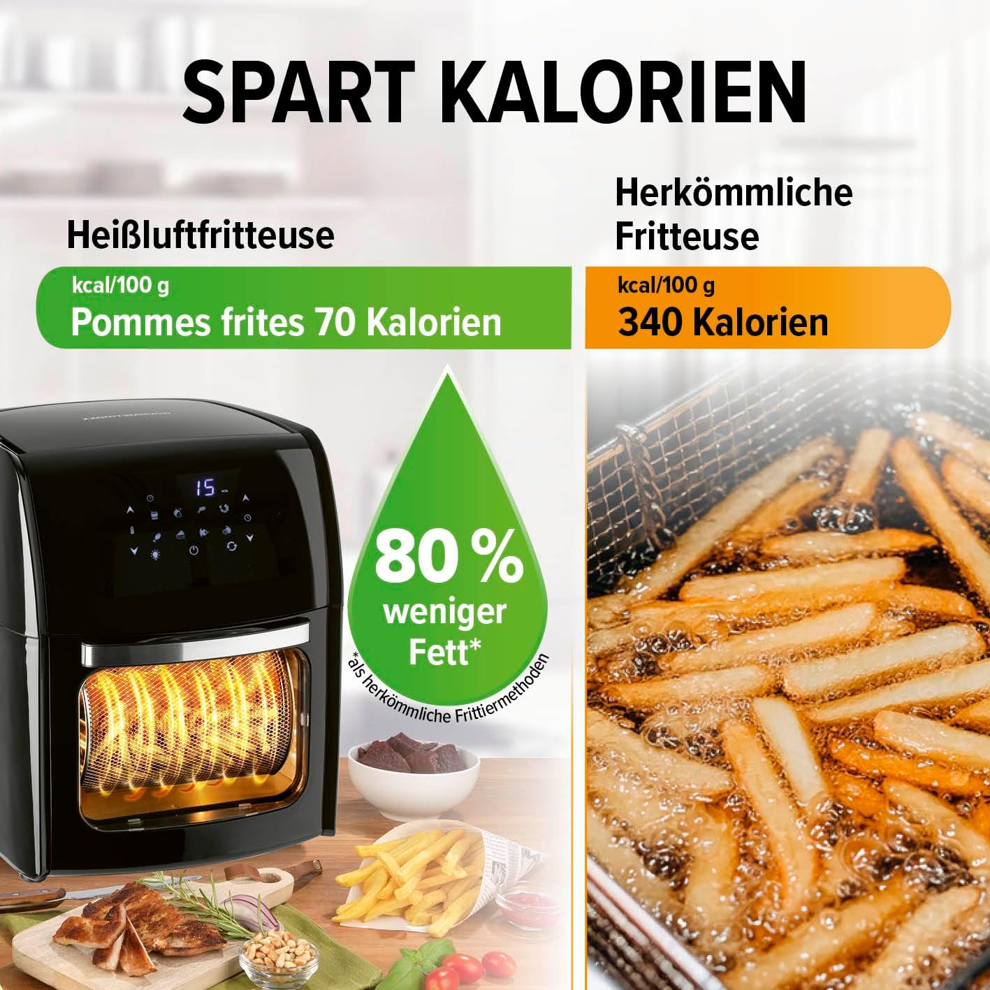 Открийте нашия фритюрник с горещ въздух GOURMETmaxx с обем 4,5 литра - вашият нов кухненски помощник за приготвяне на вкусни ястия с ниско съдържание на мазнини. Пригответе хрупкави пържени картофи, сочни пилешки бутчета или кексчета на ниска цена - благодарение на 360° въздушен поток, храната ви ще бъде хрупкава отвън и ще остане крехка отвътре. Ясният многоцветен LED сензорен дисплей в горната част ви позволява да контролирате прецизно: регулирайте температурата плавно между 80 и 200 °C и използвайте практичната функция на 60-минутен таймер за прецизна подготовка. Със седем многофункционални функции - пържене, печене, затопляне, гриловане, готвене, затопляне и пържене - вашата кухня се превръща в гурме работилница. Особено практично: Седемте предварително зададени програми за пилешки крилца, пържени картофи, риба, пържола, кекс, скариди и пилешки бутчета правят приготвянето на любимите ви ястия лесно. Дръжката с хладно докосване осигурява безопасна работа, а елегантният, черен дизайн изглежда страхотно във всяка кухня. Идеален за 2-4 души, можете без усилие да приготвите до 500 г златистокафяви пържени картофи с фритюрника с горещ въздух с мощност 1500 вата. Почистване? Лесно! Кошницата за пържене и решетката са с незалепващо покритие и могат да се мият в съдомиялна машина. С тегло само 3,25 кг, фритюрникът с горещ въздух GOURMETmaxx 4,5 л е лесен за транспортиране - идеалният кухненски спътник.