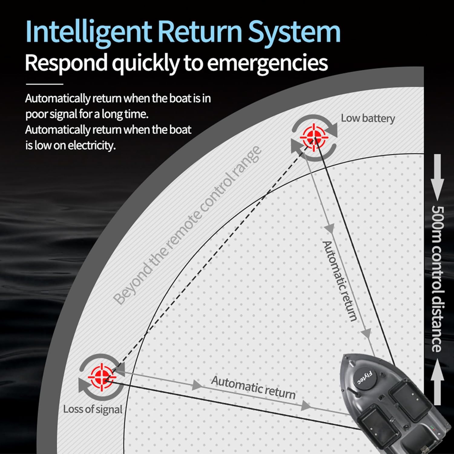 • Връщане с един бутон (GPS версия): За да избегнете загуба на лодката си във водата, препоръчваме да настроите разстоянието до брега на "1" при първата употреба. Така лодката ще се върне автоматично, когато батерията е празна или няма GPS сигнал.