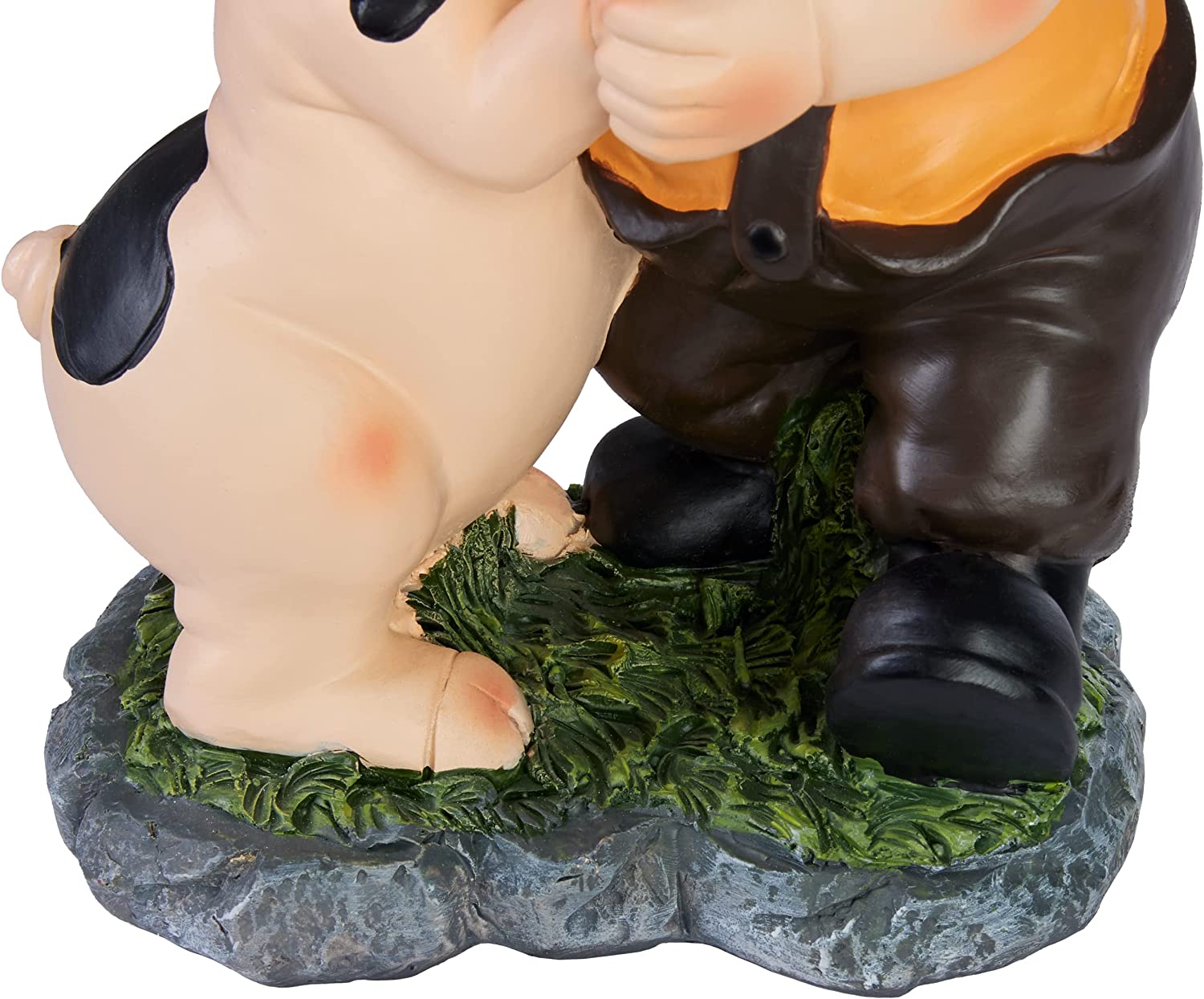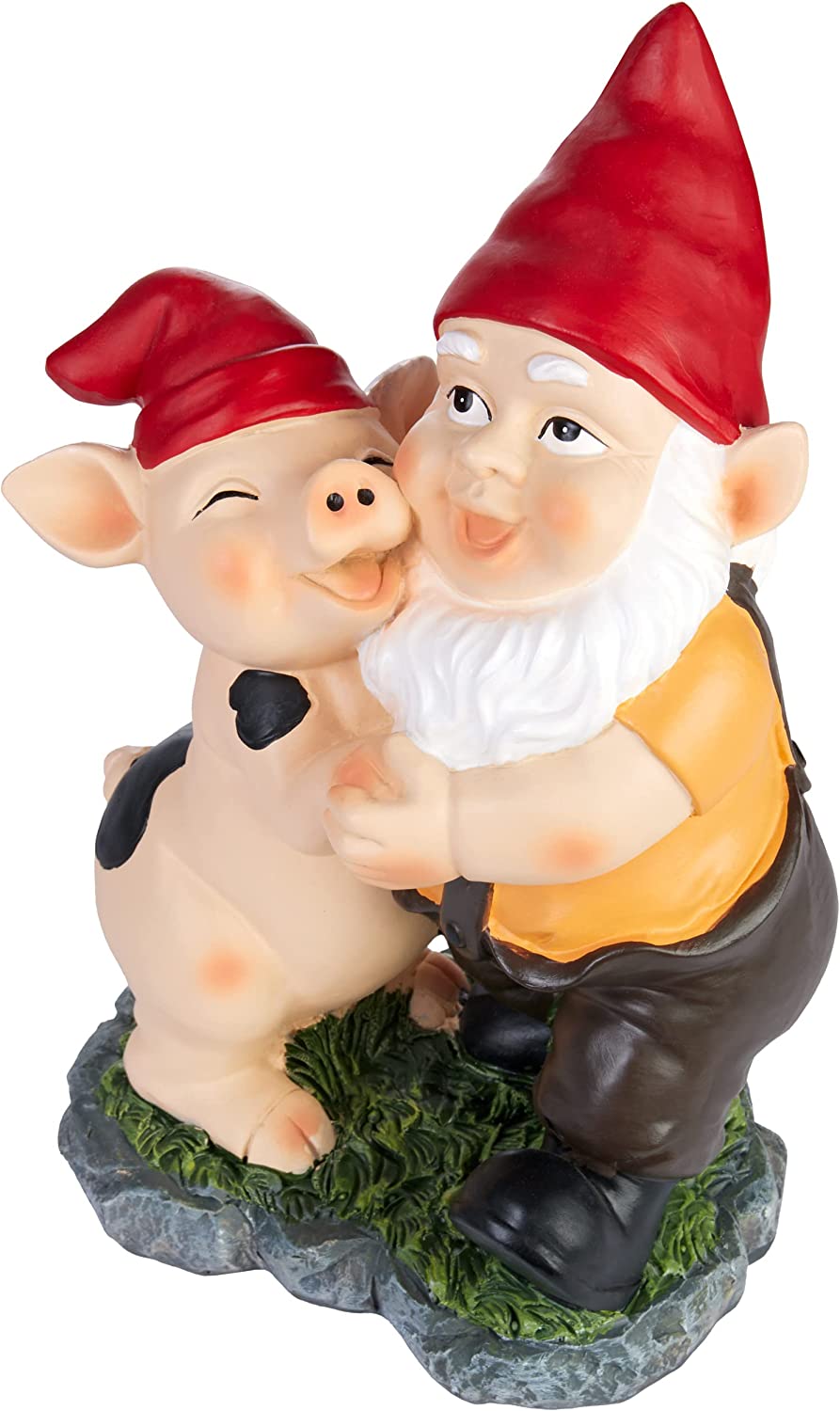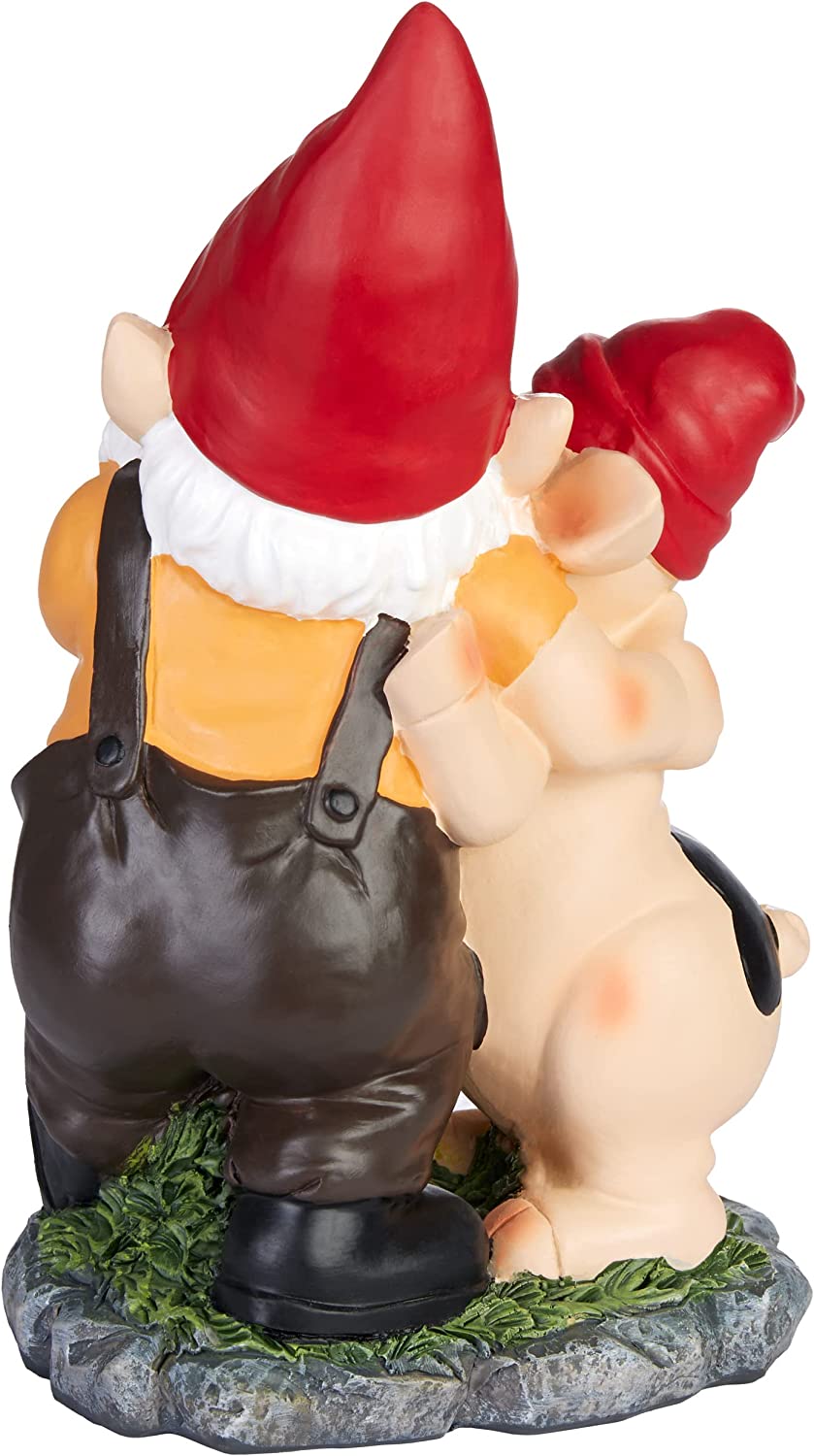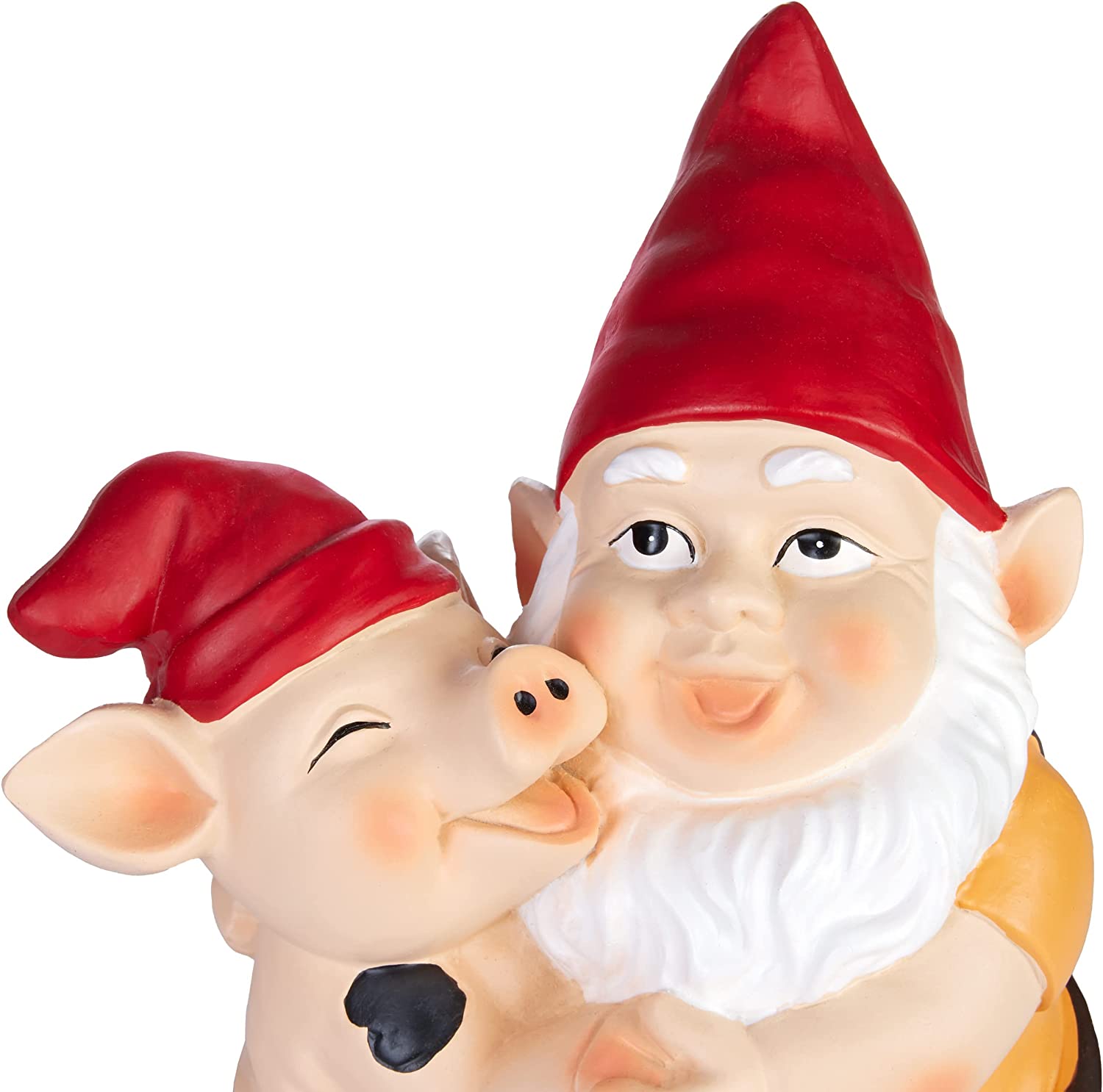 • Веселото гномче с оранжева риза и червена шапка танцува с най-добрия си приятел: прасенцето. Издръжливият, устойчив на атмосферни влияния материал на статуята на градинския гном и мощните цветове я правят популярен подарък за фермери и любители.