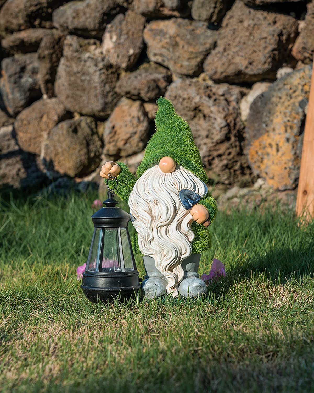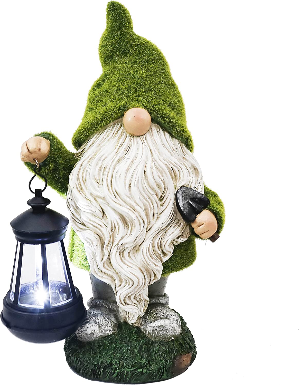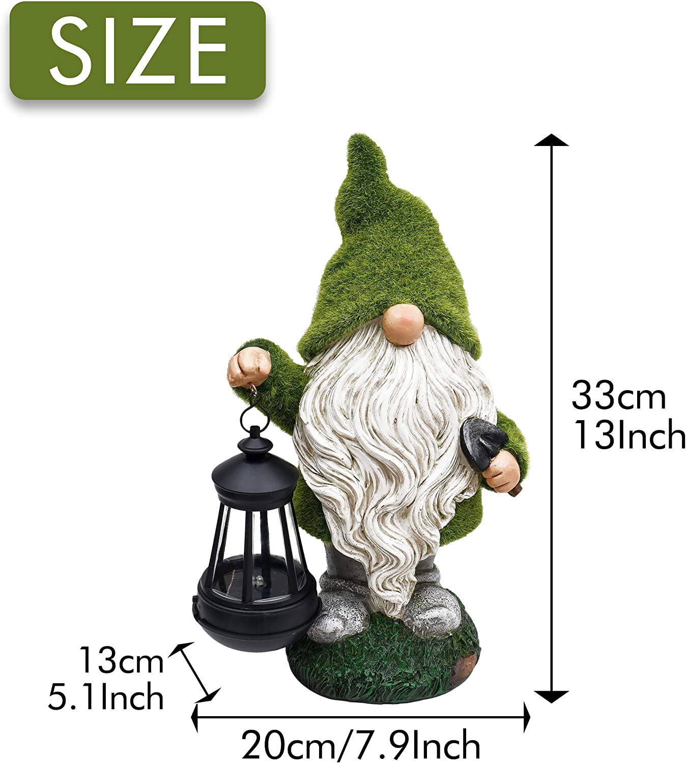 • Размери: прибл. 20 х 13 х 33 см. Материал: смола. Шапката и дрехите на фигурата на градинския гном са покрити с мъх, а в ръката си градинската фигура на джуджето носи малък соларен фенер. Така че забавното гномче осветява пътя ви и също така осигурява атмосферни моменти.