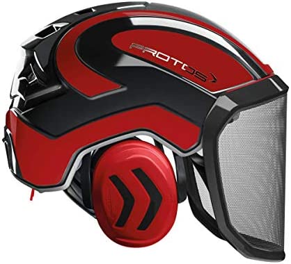 Градинскa защитна каска Protos, ABS пластмасова, С предпазител за уши, Регулируем размер, Защитен мрежест екран, Червена