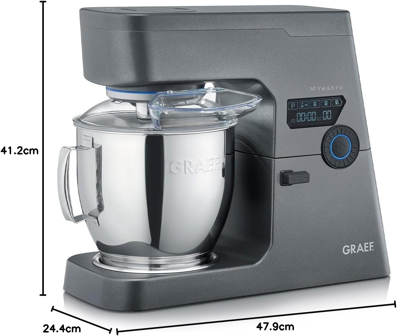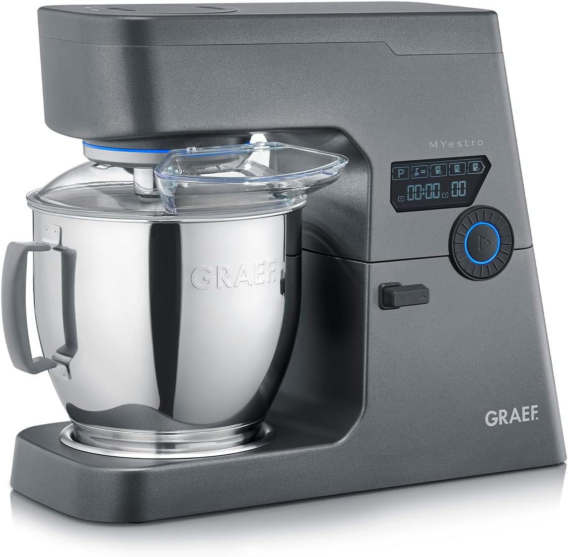 Кухненският робот MYestro от Graef е истински мощен робот и идеалният кухненски партньор за любителите на хляб, семействата и любителите пекари с голям апетит. Особено когато става въпрос за домашно печене на „хляб“ с хрупкава коричка и сочна трохичка. Причината: „MYestro“ е оборудван с мощен професионален DC мотор с мощност 800 вата, който не само обработва тежки (хлябни) теста и големи количества без усилие в 7-литровата купа от неръждаема стомана, но и меси, разбърква и разбива безшумно при работа с пълно натоварване и с висока плавност.