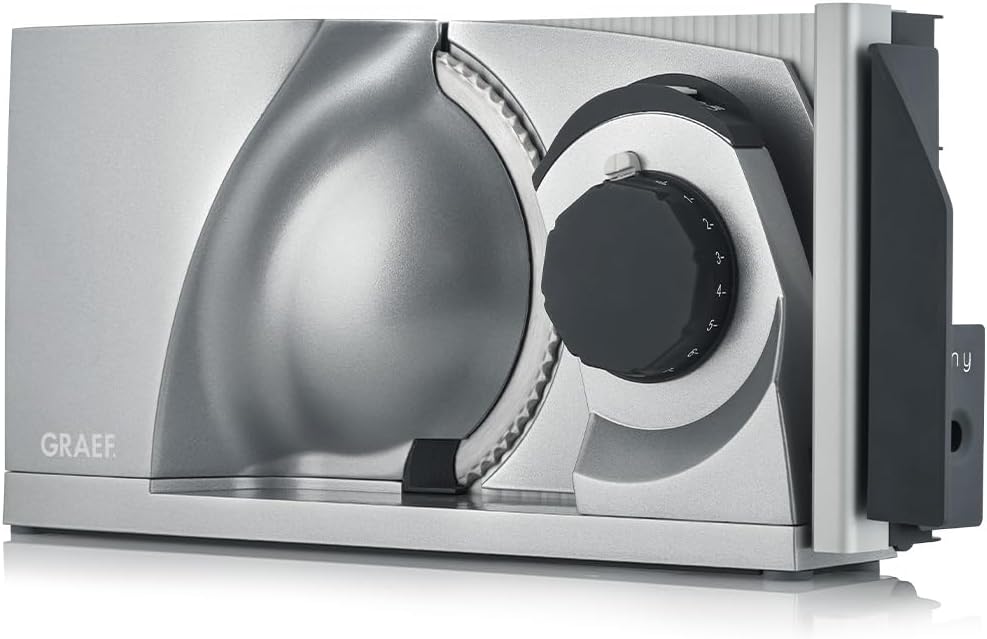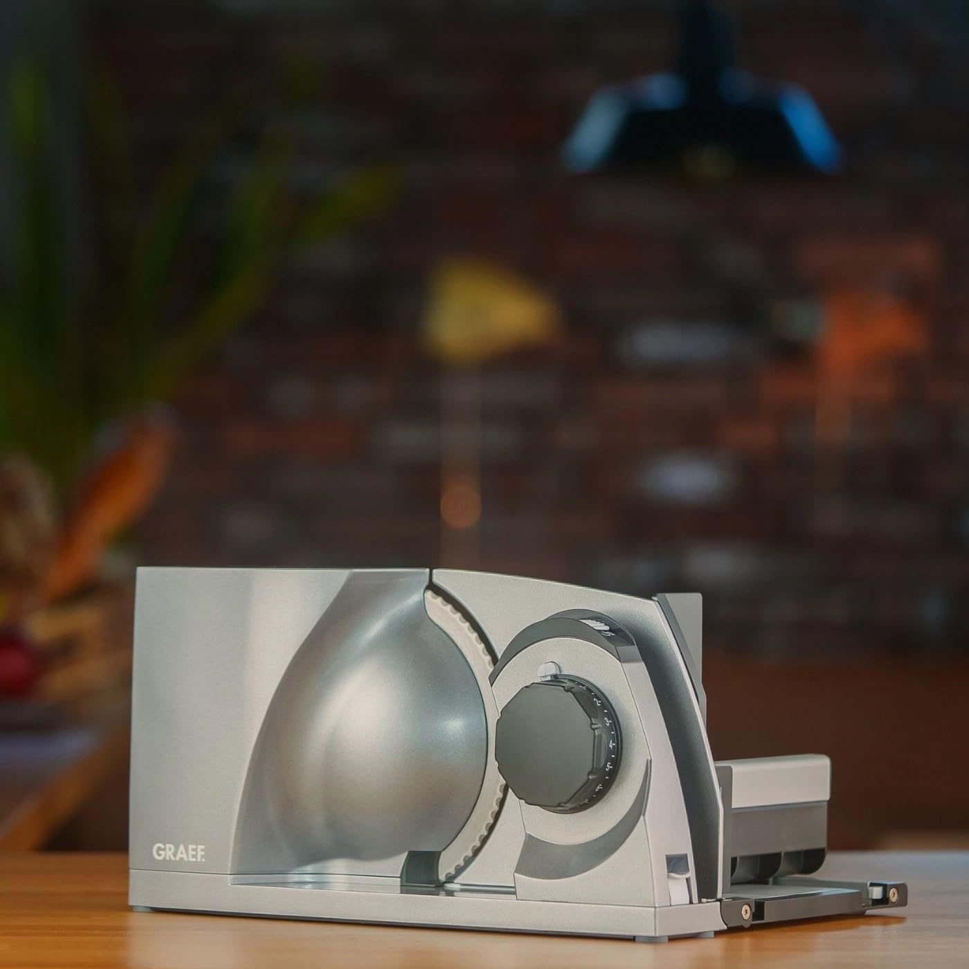 GRAEF MYtiny Сгъваема универсална резачка, Универсална електрическа машина за рязане за кухня MT1000, Резачка за колбаси, зеленчуци, хляб, Универсална резачка, Сгъваема, Сребърна