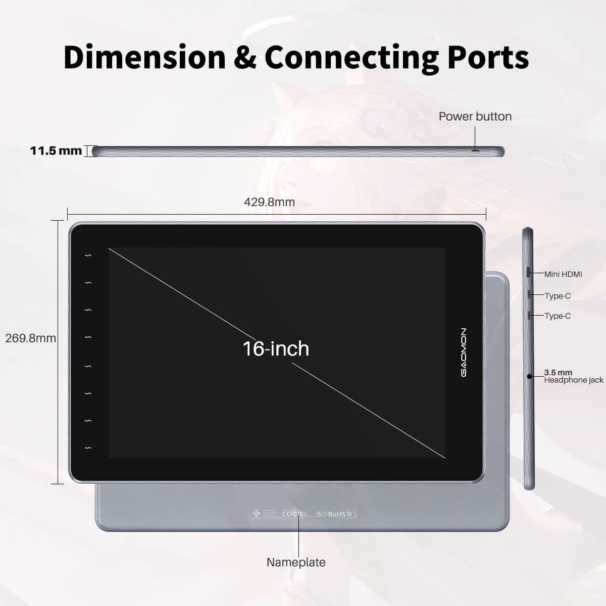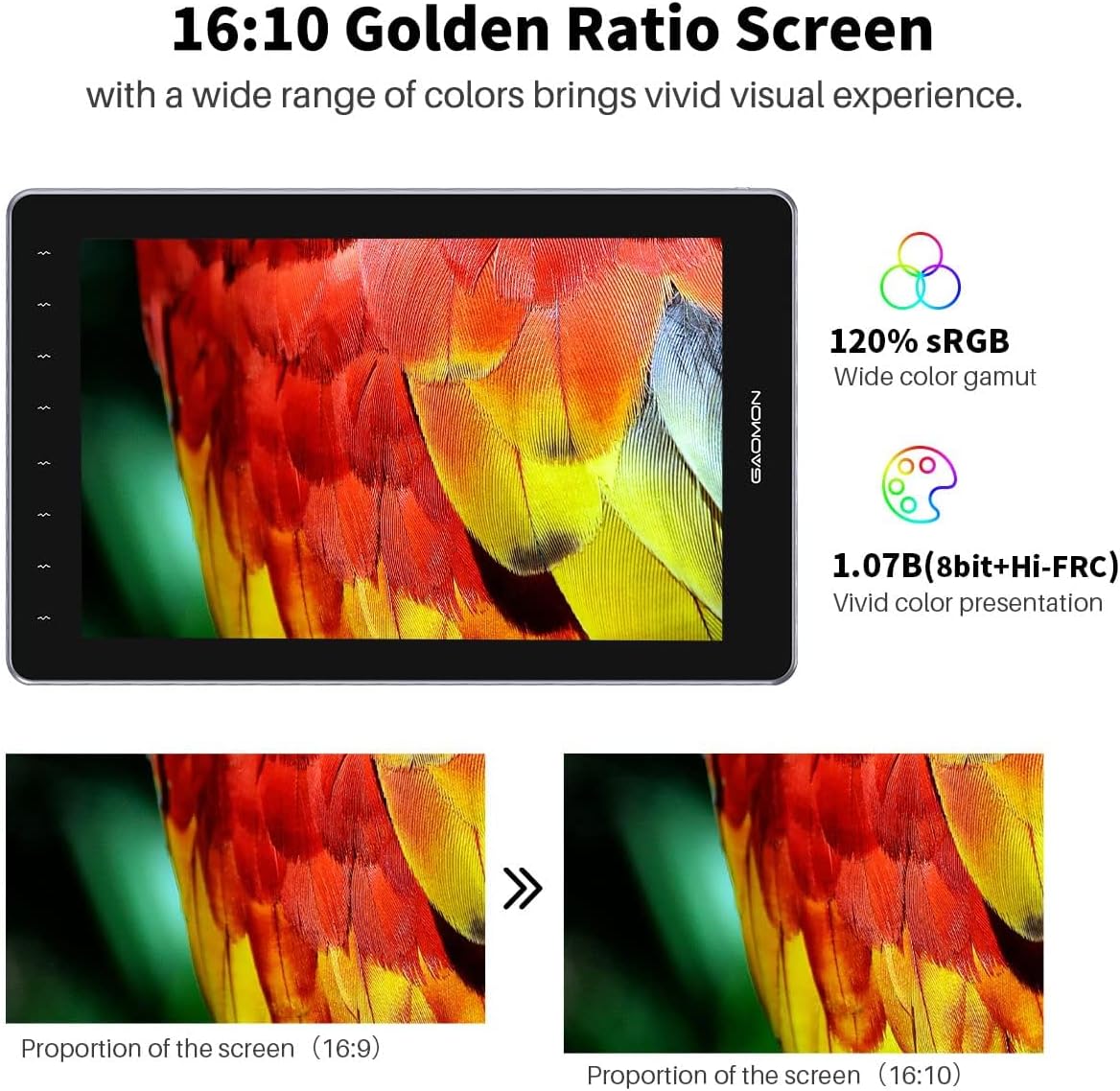 Графичен таблет GAOMON PD1610 2.5K QHD с дисплей, 120% sRGB пълно ламиниране на екрана, функция за накланяне, 16-инчов таблет за рисуване за Win, MacOS, Android