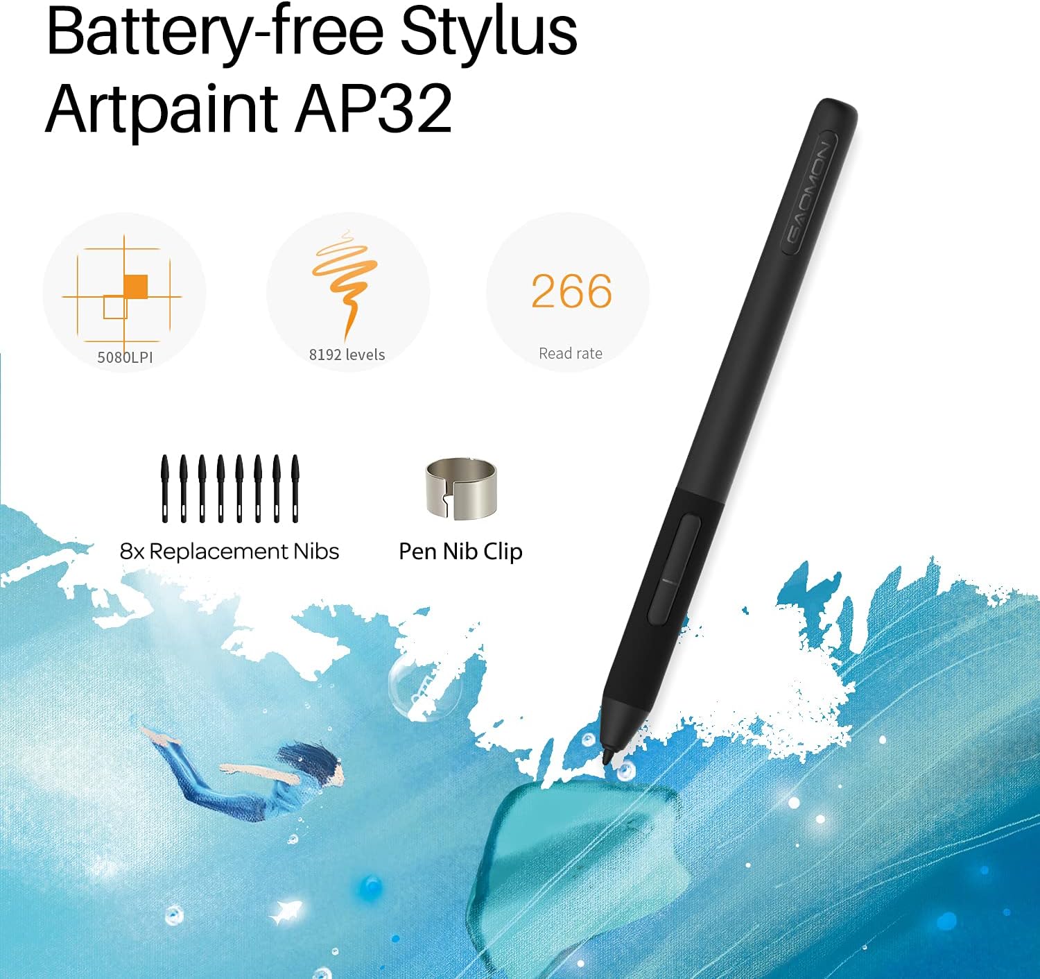 • 【AP32 съвместим стилус】Стилусът без батерии елиминира неудобството от зареждането на писалката. 【8192 нива на натиск и 4 персонализируеми експресни клавиша】Той предлага прецизен контрол и точност на върха на пръстите ви, което ви позволява да рисувате по-естествени линии и да подобрите творческия си резултат. 4-те персонализируеми клавиша могат да бъдат конфигурирани да изпълняват повече функции, както желаете. Използването им по време на работа значително ще подобри работния ви процес.