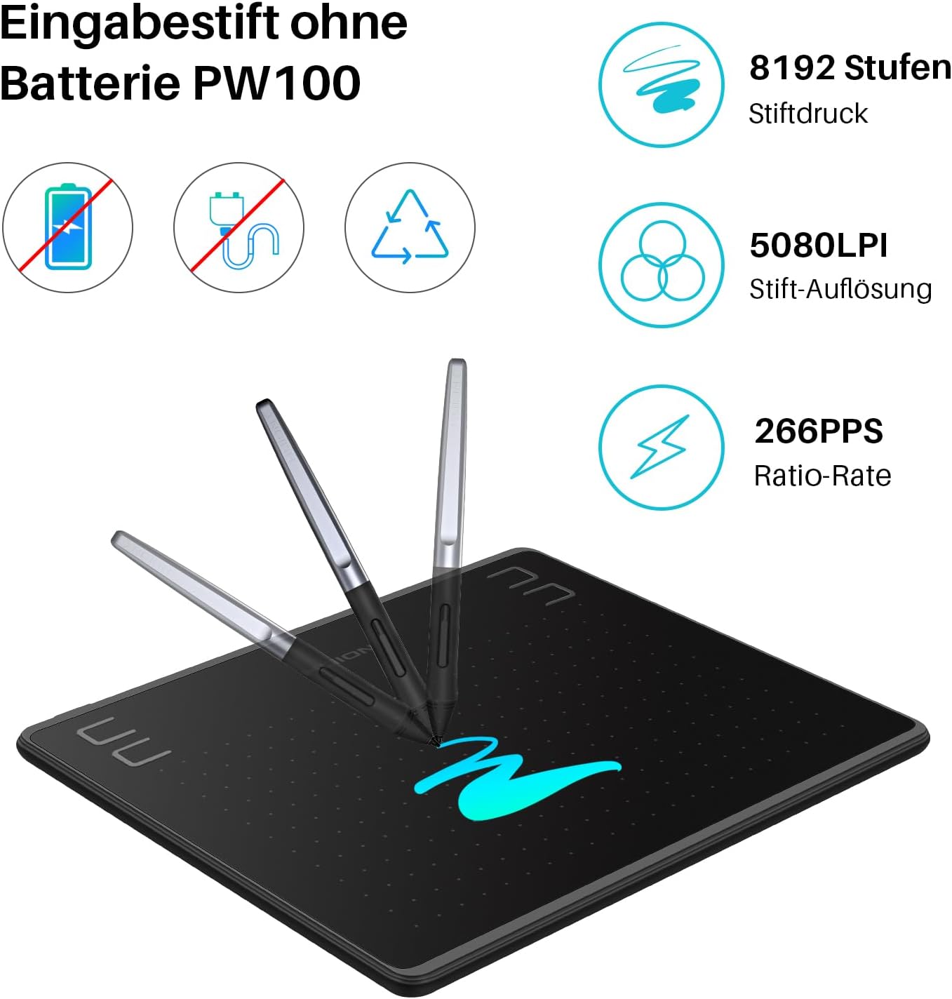 • Писалка без батерии PW100: Няма нужда от зареждане или използване на батерии. Два персонализируеми бутона. Държачът за писалка с 8 вътрешни върха позволява поставянето ѝ вертикално, осигурявайки отлична защита. Съвместима с програми на Microsoft Office като Word, PowerPoint, OneNote и други.