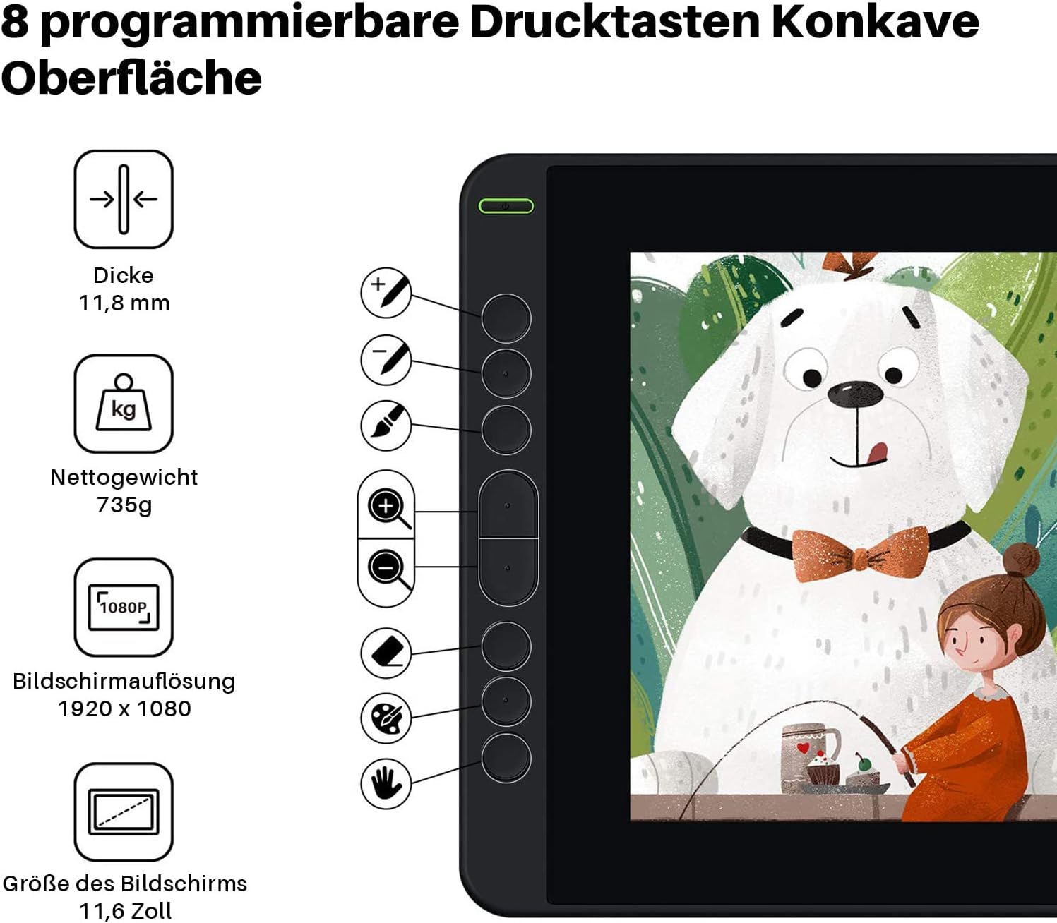 Графичен таблет HUION Kamvas 12 с дисплей, 11,6-инчов дисплей с писалка без батерии, 8 Express бутона, регулируема стойка, таблет за рисуване за Switch игри, дистанционно управление за обучение, работа