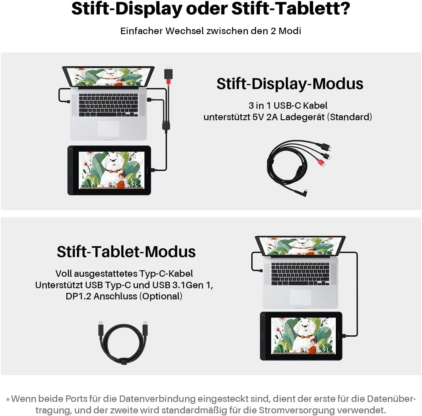 • 【Подобрена кабелна връзка】Няма нужда от захранващ адаптер! Kamvas 13 може лесно да се захранва от лаптоп с 5V или повече, използвайки включените HDMI и два USB 3-в-1 кабела. Освен това, Kamvas 13 поддържа и Type-C към Type-C връзка, използвайки един пълнофункционален Type-C кабел (не е включен), който може да предава данни, захранване и DP сигнал едновременно.