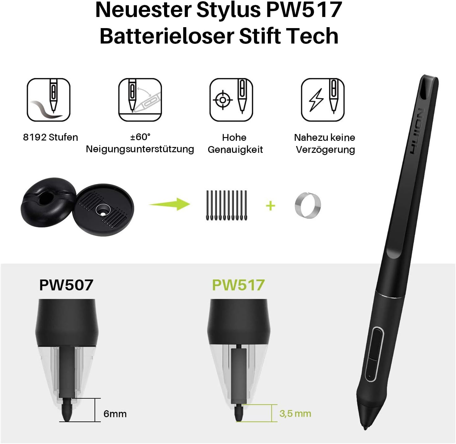 • 【PenTech 3.0 PW517 без батерии】Оптимизиран с капацитивен сензор за натиск Huion PenTech 3.0 и стабилни върхове на писалката, PW517 ви предлага най-естественото и чувствително рисуване, точно както при използване на обикновена писалка. В комбинация с 8192 нива на натиск на писалката, функция за накланяне от 60 градуса и скорост на отчитане от 266 страници в минута, PW517 реагира мигновено на накланянето на ръката ви и всяко движение с невероятна прецизност и контрол.