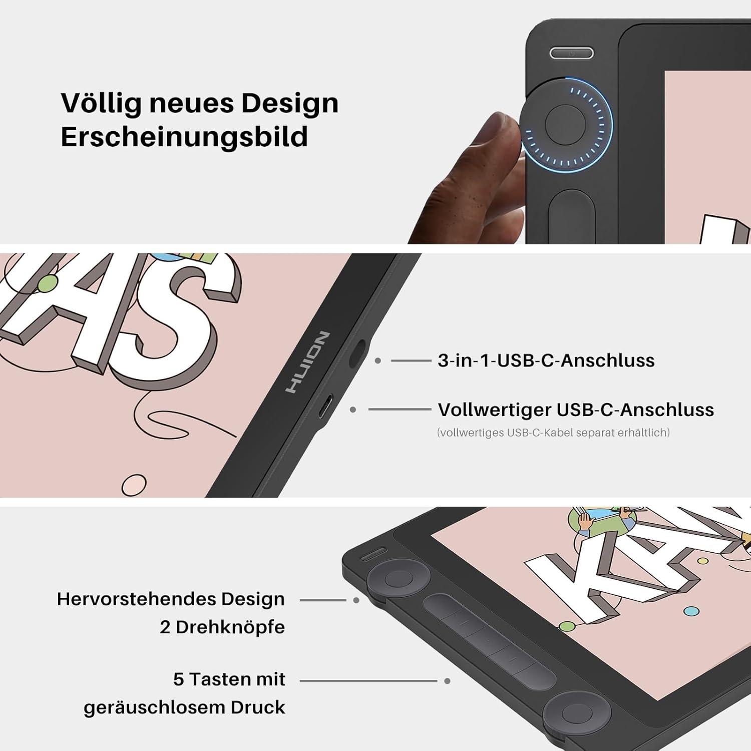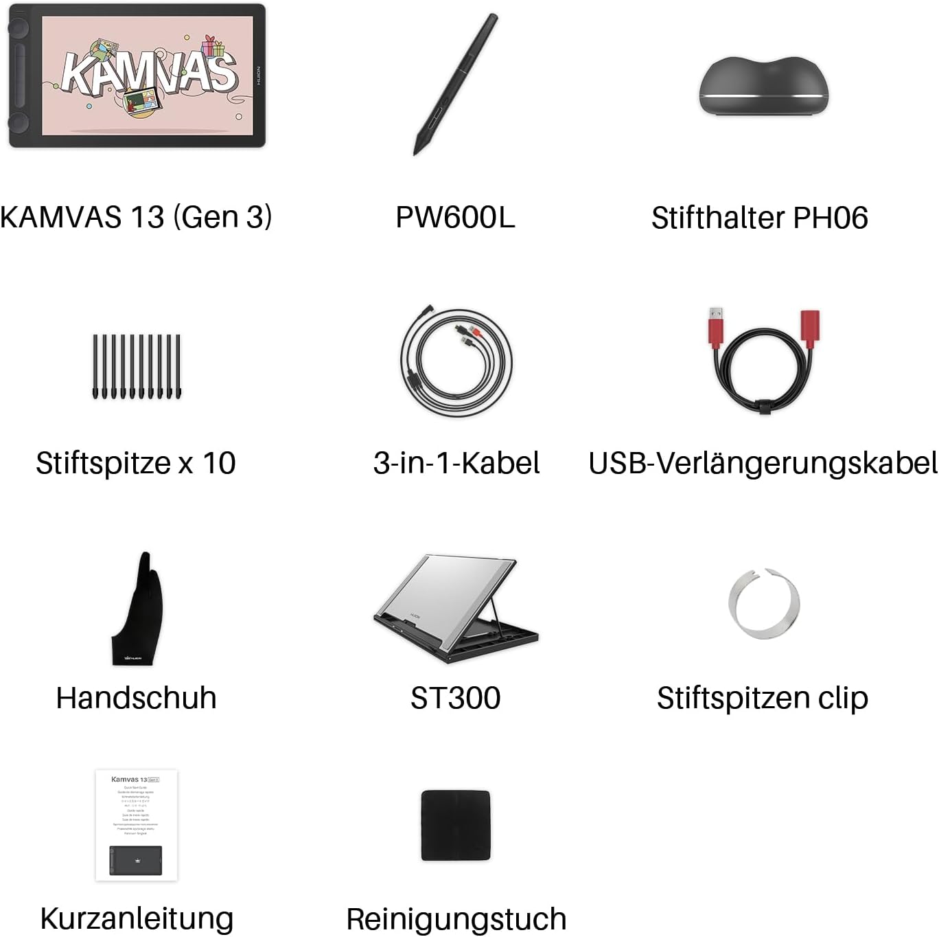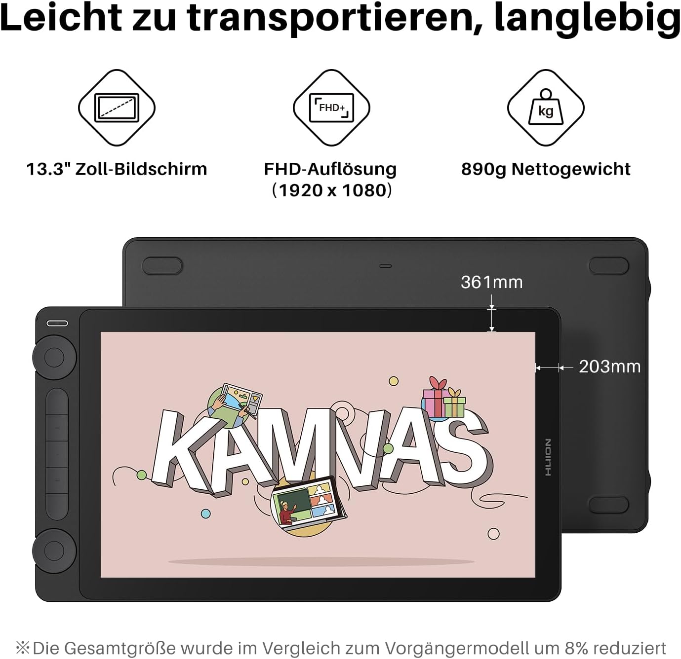 Графичен таблет HUION Kamvas 13 Gen 3 с дисплей, 13,3-инчов монитор за рисуване Canvas Glass, 99% sRGB покритие, нов PenTech 4.0, 16384 натиск на писалката, два контролера, регулируема стойка, черен