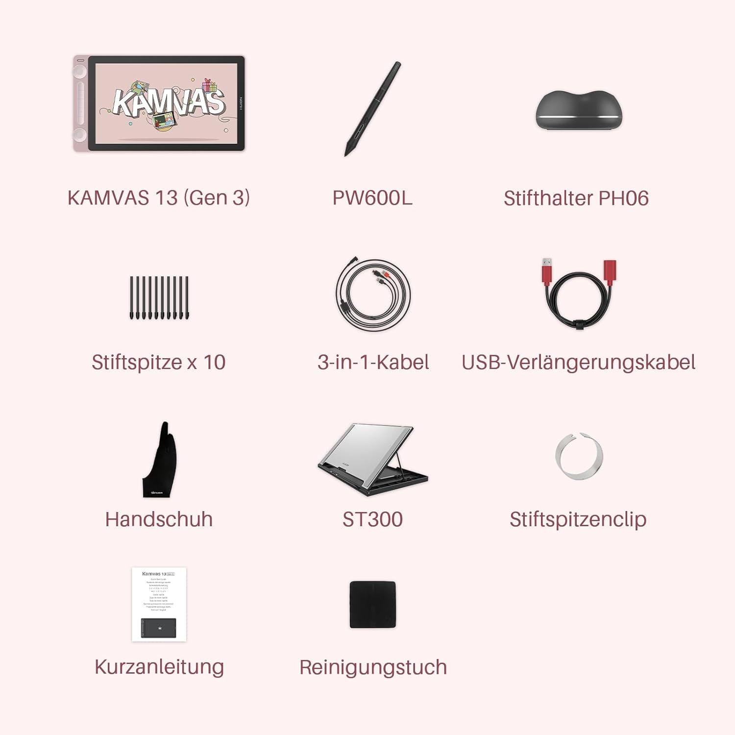 Графичен таблет HUION Kamvas 13 Gen 3 с дисплей, гравирано стъкло против отблясъци, PenTech 4.0, 16384 печат с писалка, регулируема стойка, 13,3-инчов таблет за рисуване с двоен циферблат за дизайнер, художник, розов