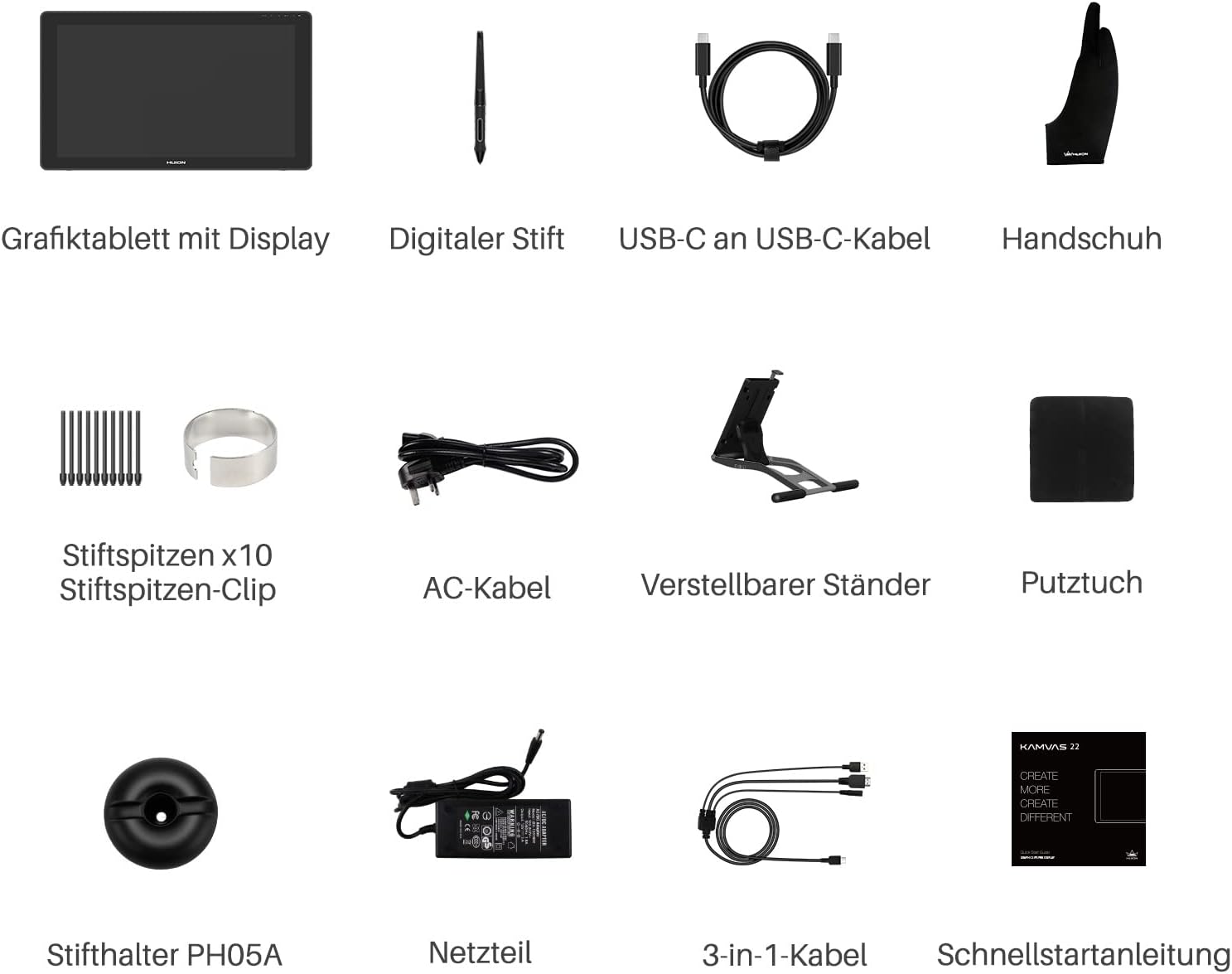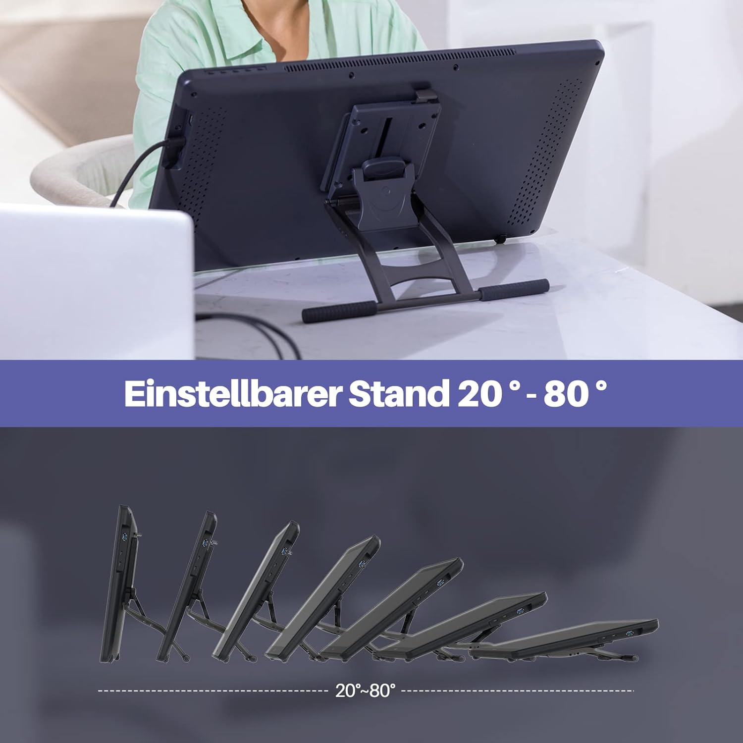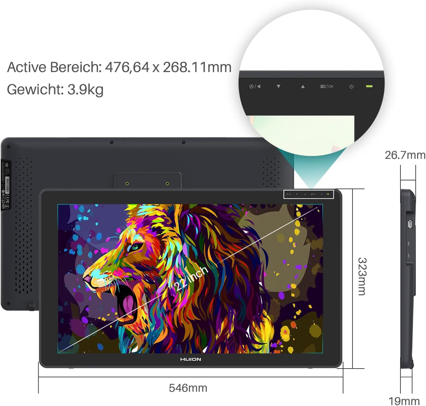 Графичен таблет HUION Kamvas 22 Plus с дисплей с изцяло ламиниран QD екран, 140% RGB подсветка, поддръжка на Android, идеален за домашни работи и дистанционно обучение, регулируема стойка - 21,5 инча