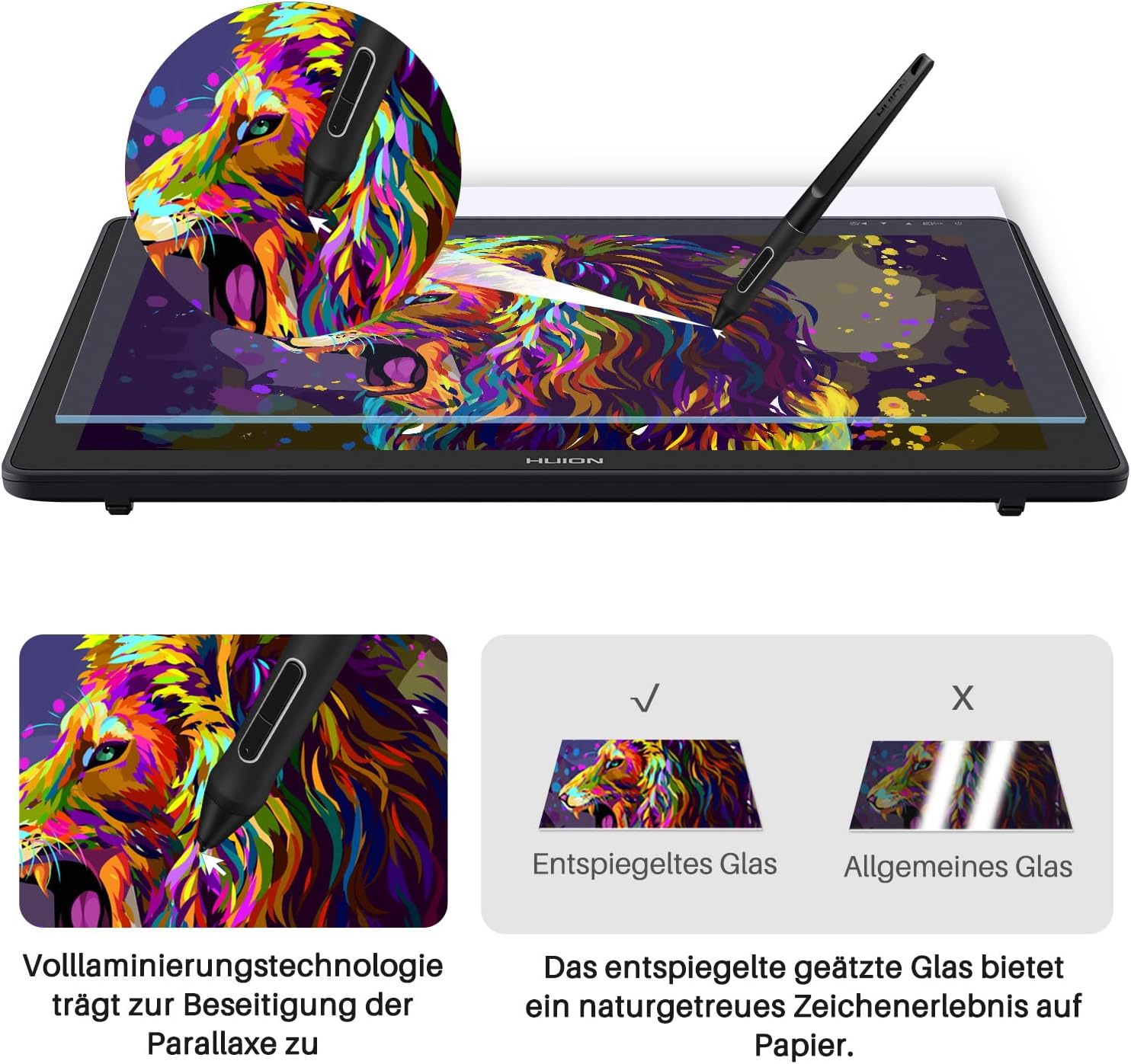 • Напълно ламиниран екран: Дигиталният таблет за рисуване Kamvas Pro 12 е с AG стъкло. То е химически гравирано, за да увеличи триенето и да симулира истинско рисуване. Екранът с пълна повърхност ефективно намалява смущенията и отблясъците от околната светлина, скъсява разстоянието между върха на писалката и курсора и ви дава усещането за рисуване върху хартия.