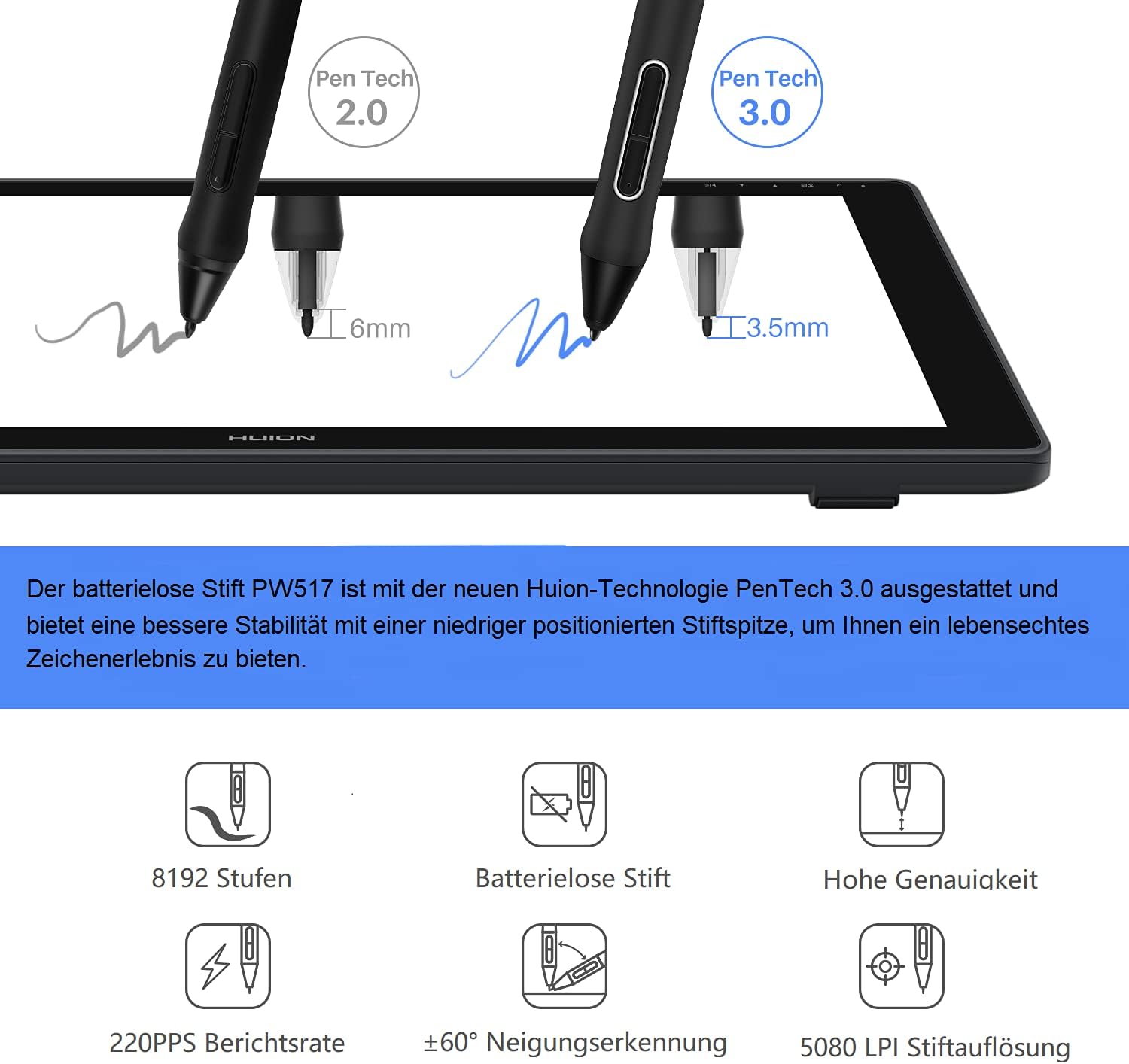 • Захранвана от PenTech 3.0, писалката PW517 без батерии предлага на потребителите по-прецизни движения на писалката и естествено рисуване. Нейните 8192 нива на натиск и функцията за накланяне от ±60° помагат да уловите вдъхновението си мигновено и без забавяне.
