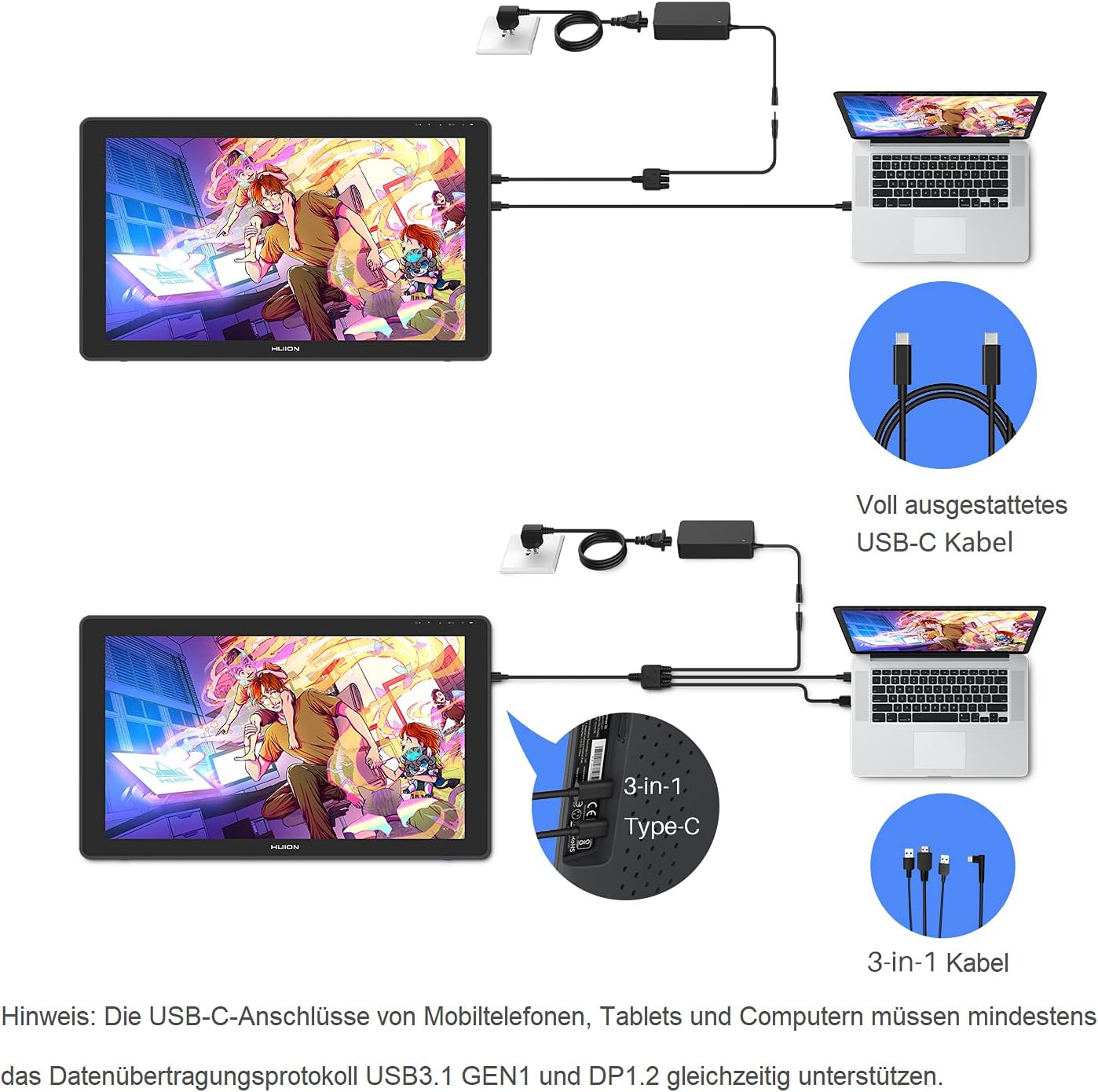 • Кабел 3 в 1 ви помага да елиминирате хаоса и да свържете вашия компютър, лаптоп, Mac или Android устройство към дисплея с писалка Kamvas 16 2021. Той също така поддържа Type-C към Type-C връзки – можете лесно да свържете лаптоп с Type-C към Kamavas 16 2021 само с един кабел. Включени са 3 в 1 кабел и пълнофункционалният USB-C към USB-C кабел.