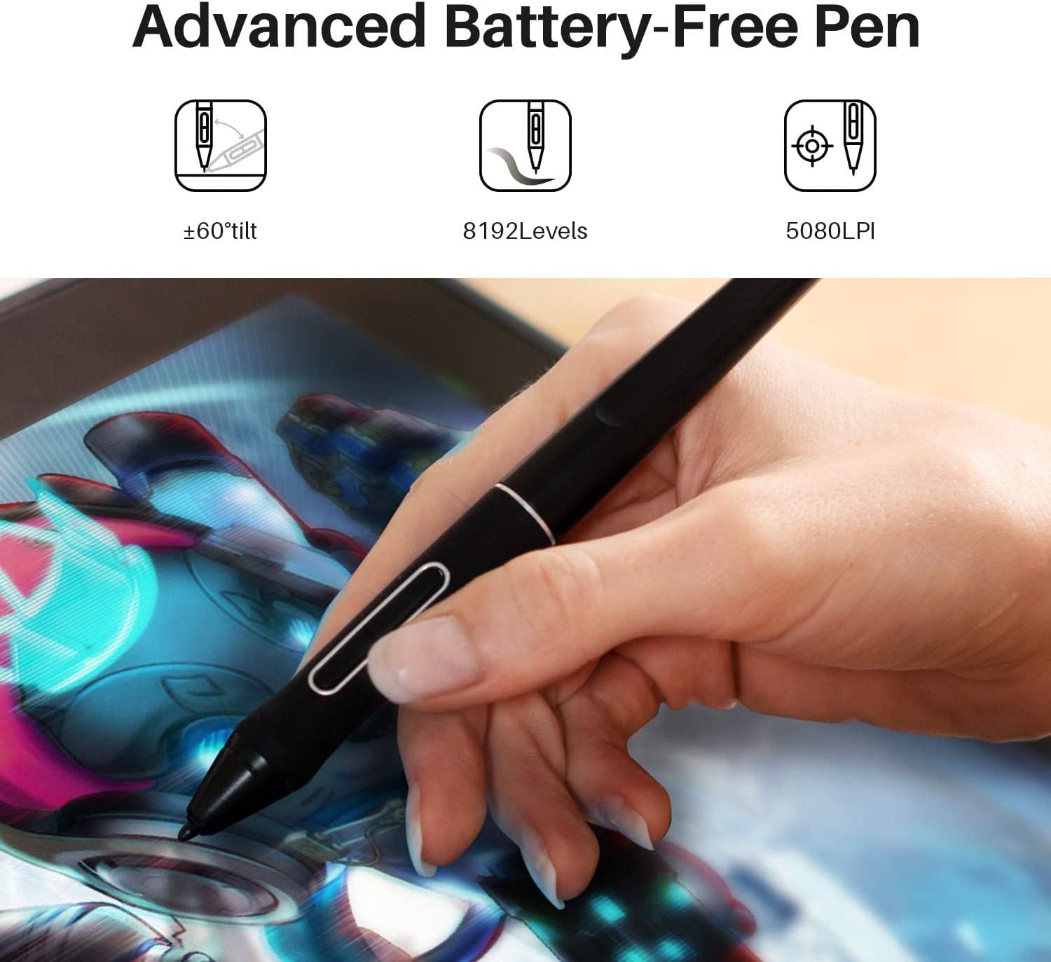 • Подобрена технология за писалка без батерии: Таблетът за рисуване Kamvas Pro 12 е оборудван с дигитална писалка PW507 без батерии, която поддържа нива на разпознаване на наклон от ±60 и може лесно да симулира ефекта на накланяне от специални щрихи. Дигиталната писалка PW507 разполага с 8192 нива на чувствителност на натиск, честота на отчитане от 266 PPS и резолюция на ръкописен текст от 5080 LPI, като всички те са на най-високо ниво в индустрията.