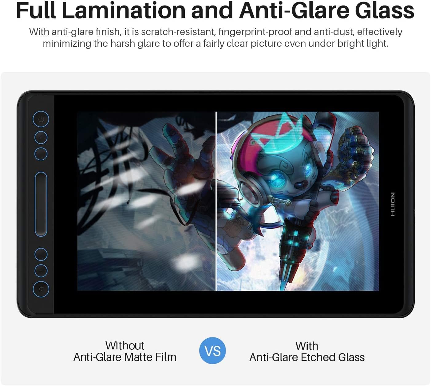• Напълно ламиниран екран: Дигиталният таблет за рисуване Kamvas Pro 12 е с AG стъкло. То е химически гравирано, за да увеличи триенето и да симулира истинско рисуване. Екранът с пълна повърхност ефективно намалява смущенията и отблясъците от околната светлина, скъсява разстоянието между върха на писалката и курсора и ви дава усещането за рисуване върху хартия.