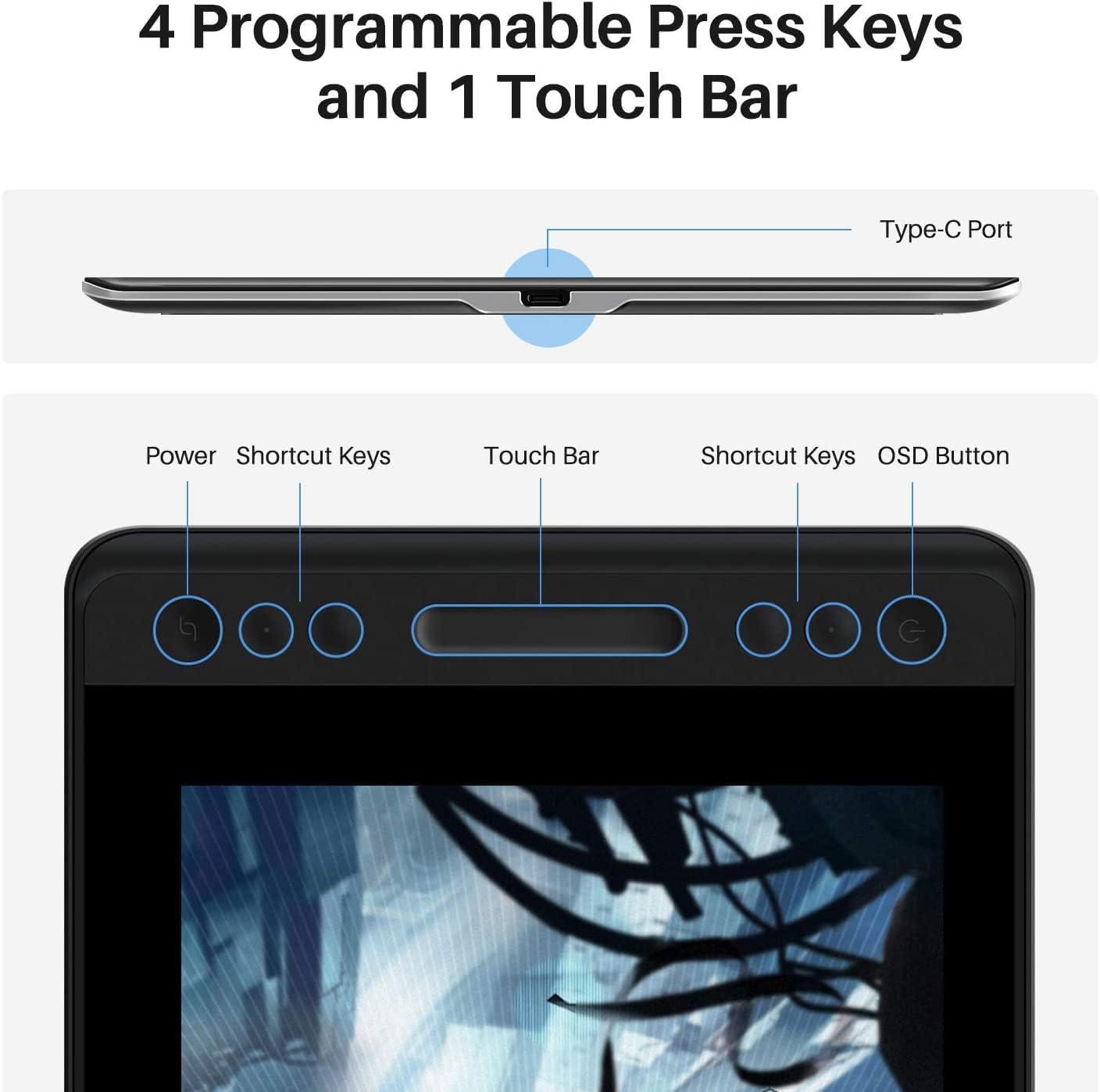 • 4 програмируеми бързи клавиша и 1 сензорна лента: Дисплеят Kamvas Pro с 12 писалки разполага с 4 програмируеми бързи клавиша и 1 сензорна лента. Можете да зададете клавишни комбинации в драйвера HUION според вашите предпочитания, което ви позволява да програмирате мащабиране на платното, регулиране на четката и превъртане на страницата. Можете също да отворите екранното меню чрез продължително натискане на функционалния клавиш.
