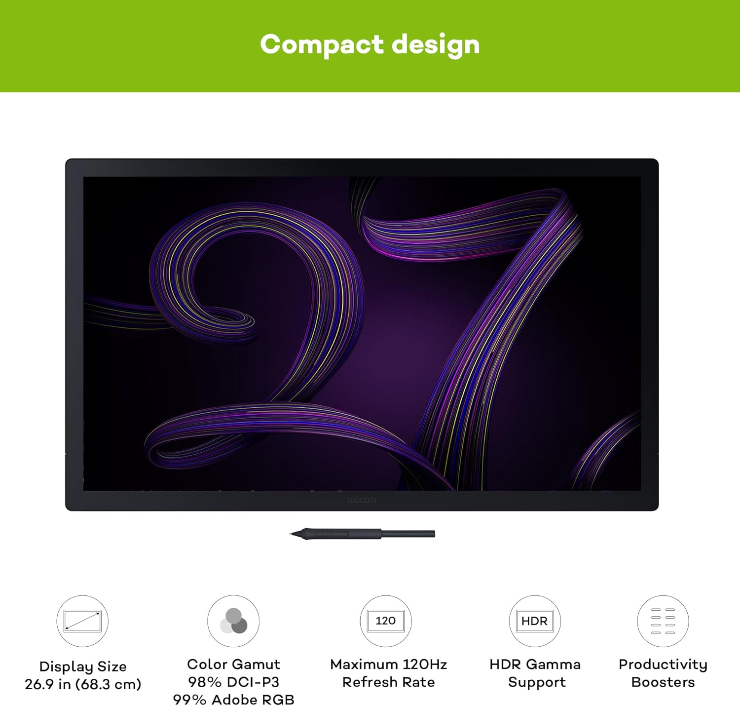 • Мощният креативен дисплей с писалка впечатлява с 24-инчов LCD екран с висока резолюция в Ultra HD - рисувайте без забавяне и се възползвайте от ненадмината точност на цветовете.