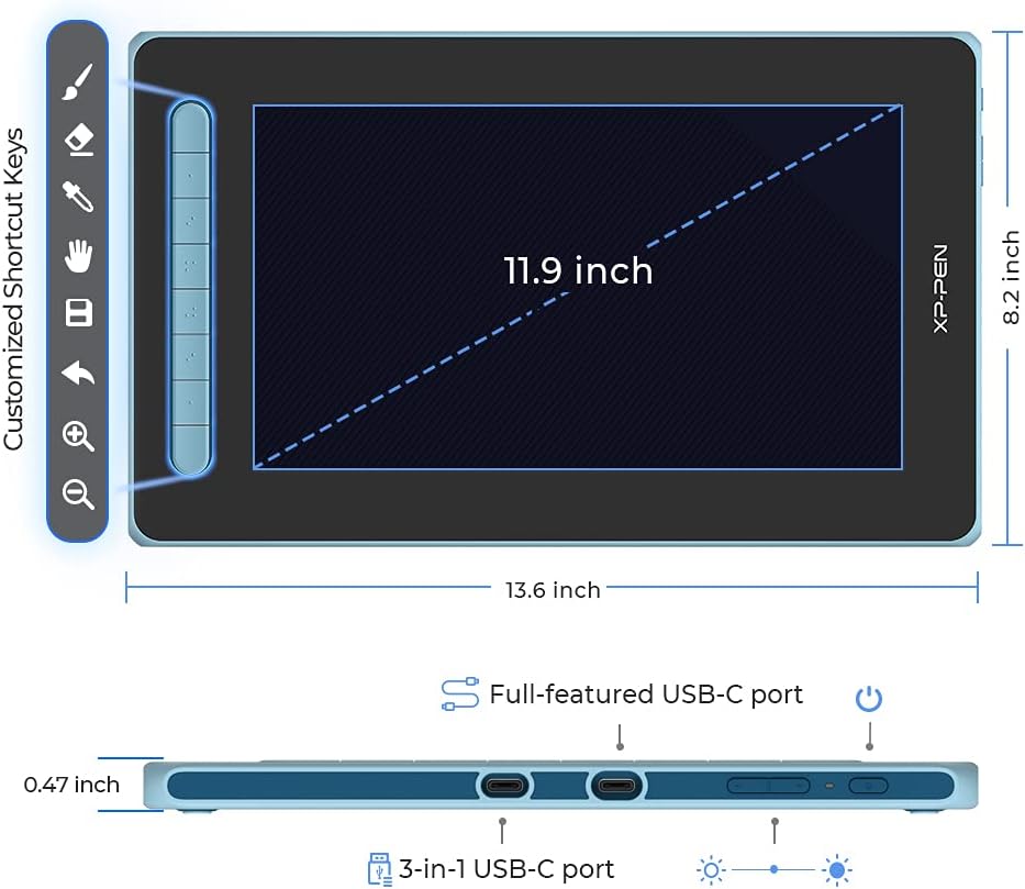 • ♚Лесна и бърза връзка: Графичният дисплей Artist 12 от 2-ро поколение разполага с два USB-C порта отстрани. Горният е за USB-C към USB-C кабел, а долният е за 3-в-1 кабел. Те предлагат различни опции за свързване и осигуряват безпроблемна връзка. (USB-C към USB-C е опционален и не е включен.)
