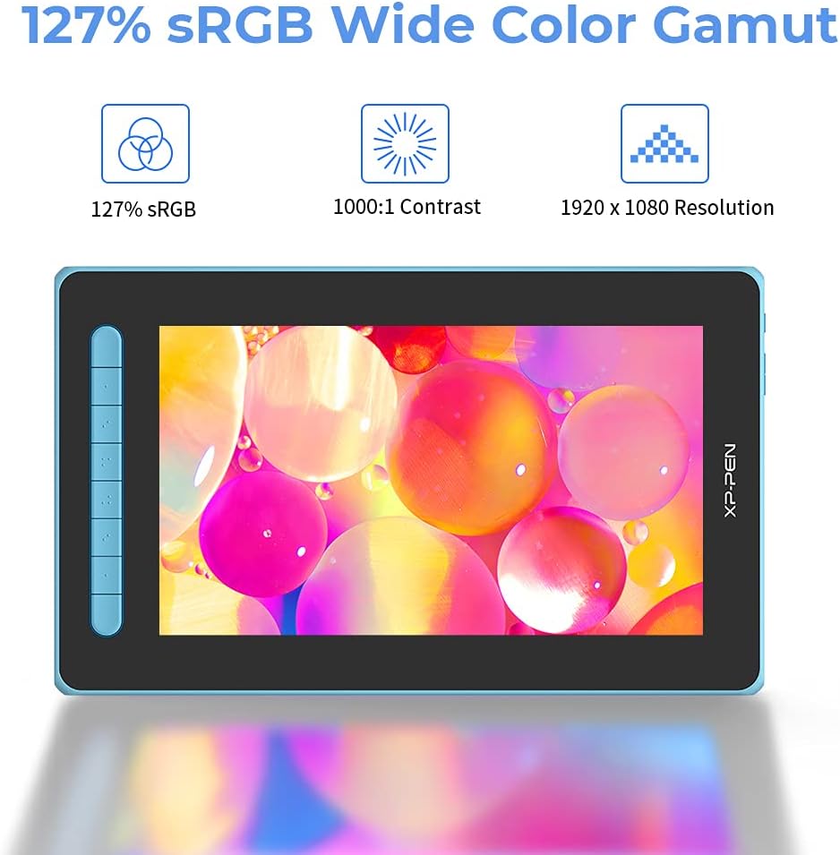 • Напълно ламиниран дисплей със 127% sRGB цветова гама: С широка 127% sRGB цветова гама, този графичен таблет Artist 12 от 2-ро поколение предлага ярко визуално изживяване с брилянтни цветове и фини детайли, дори в тъмни нощи. Напълно ламинираният дисплей с писалка минимизира паралакса и увеличава точността за естествено рисуване.