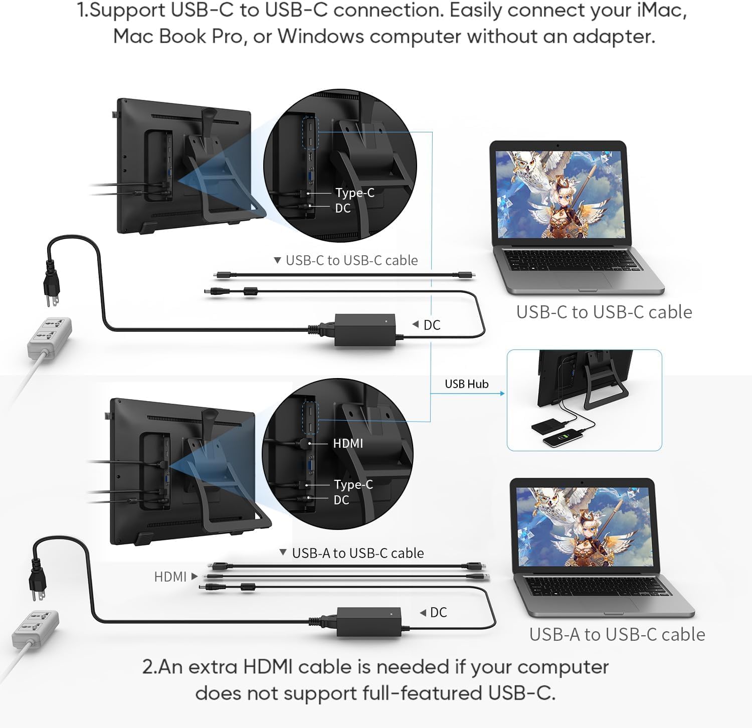 • Лесна настройка: Графичният таблет XP-PEN Artist 22R Pro поддържа USB-C към USB-C свързаност. Това позволява на рисуващия плот 22R Pro да се свързва директно с вашия iMac/Mac Book Pro или компютър с USB-C порт, без да е необходим USB-C към HDMI/USB адаптер.