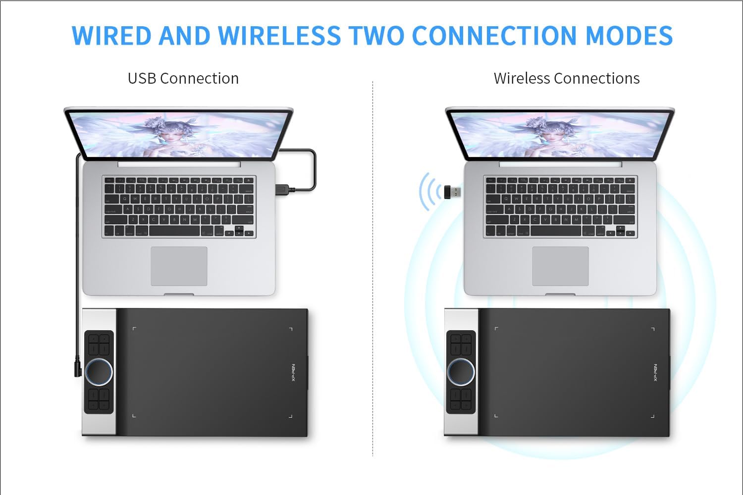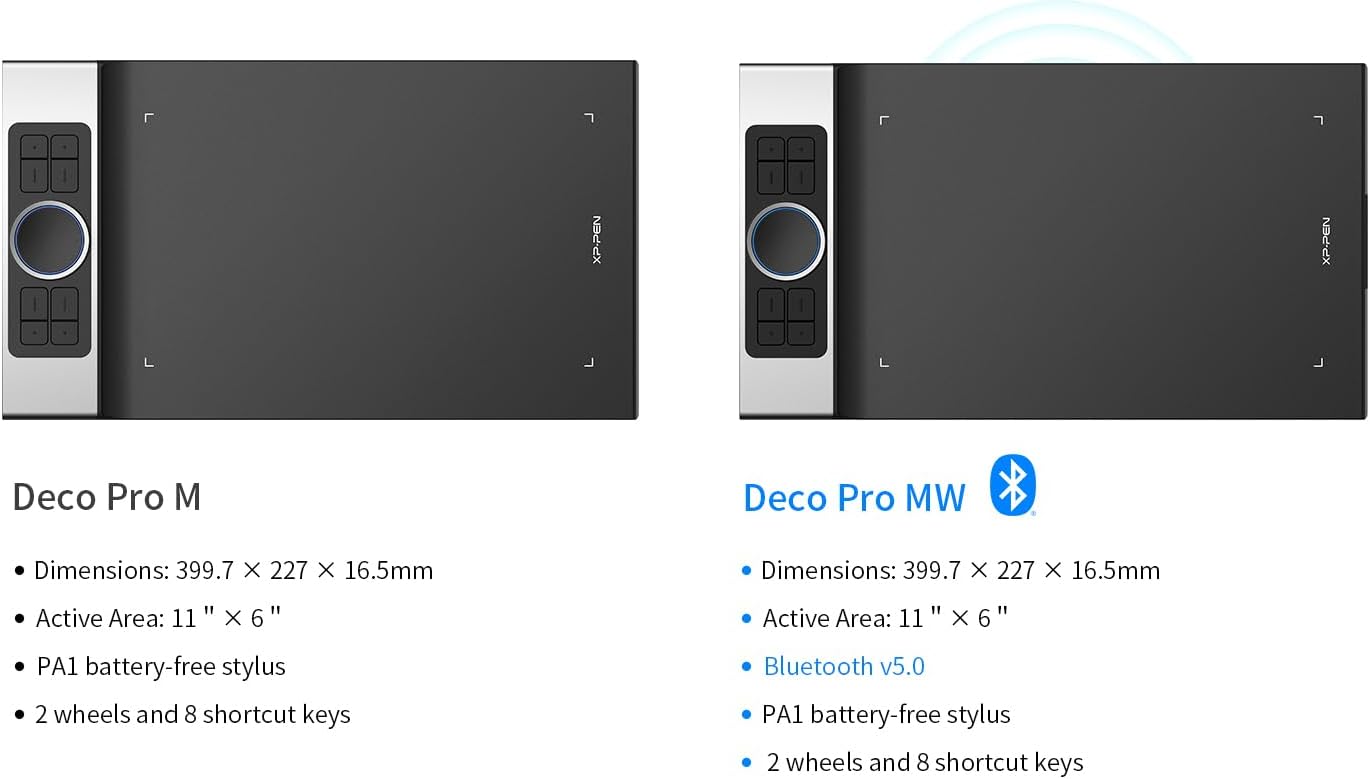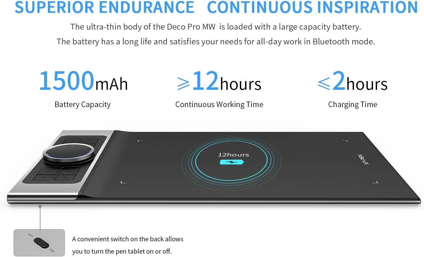 • [Безжична свързаност, неограничена креативност] Графичният таблет XP-PEN Deco Pro MW е оборудван с усъвършенствани Bluetooth v5.0 чипове за надеждна безжична връзка. Без ограниченията на кабелите и с голямата работна площ от 28 см x 15 см, имате повече свобода, когато рисувате, редактирате снимки или работите от вкъщи.