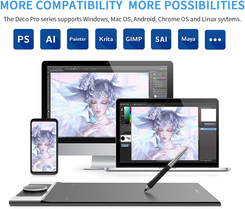 • [Широка съвместимост, широки възможности] XP-PEN Deco Pro поддържа Windows, Mac OS, Android, Chrome OS и Linux системи. Съвместим е с повечето програми за рисуване: Photoshop, SAI, Painter, Illustrator, Krista, Clip Studio, Blender 3D и други. Освободете креативността си с повече възможности.