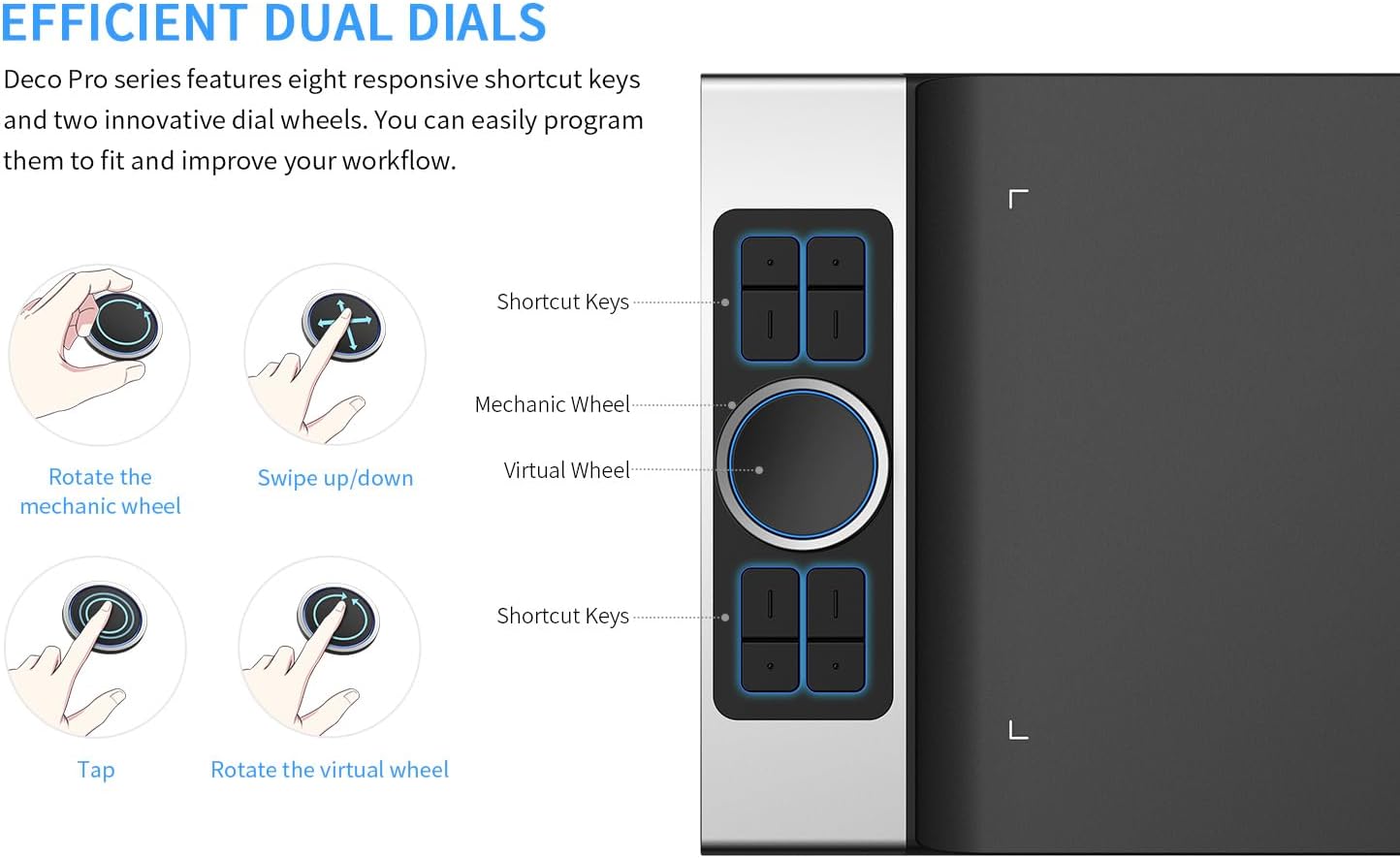 • [Изключителен външен вид, удобна работа] Перфектната комбинация от цветове (сребристо и черно) и бутоните и скрол колелцата направиха графичния таблет Deco Pro MW носител на наградата Reddot Award 2019 и наградата Good Design Award 2018. Двете програмируеми, иновативни двойни колелца и осемте бутона значително подобряват работния ви процес. Всичко е внимателно проектирано, за да ви осигури върховно изживяване при рисуване.