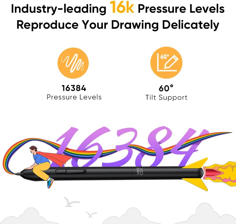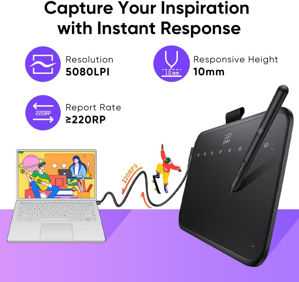 • Ултратънкият, извит дизайн предлага щедра повърхност за рисуване и намалява умората на китката. С 8 клавиша за бърз достъп и удобен стилус можете да рисувате ефективно и удобно на таблета си.