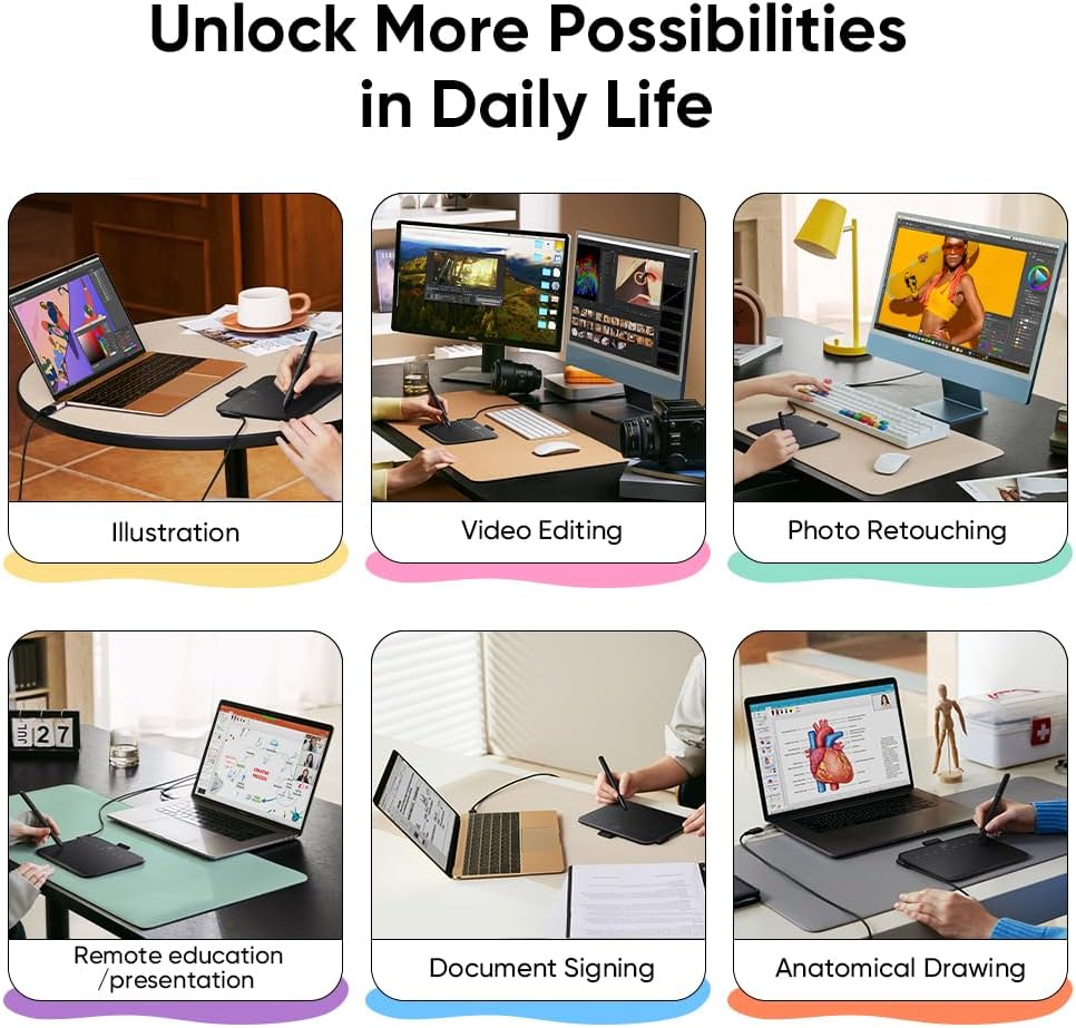 • Това е вашият перфектен спътник за игри на OSU, предлагащ завладяващо игрово изживяване с компактен размер и висока отзивчивост. Също така е идеален за илюстрации, редактиране на видео, ретуширане на снимки, онлайн обучение и жестомимично говорене.