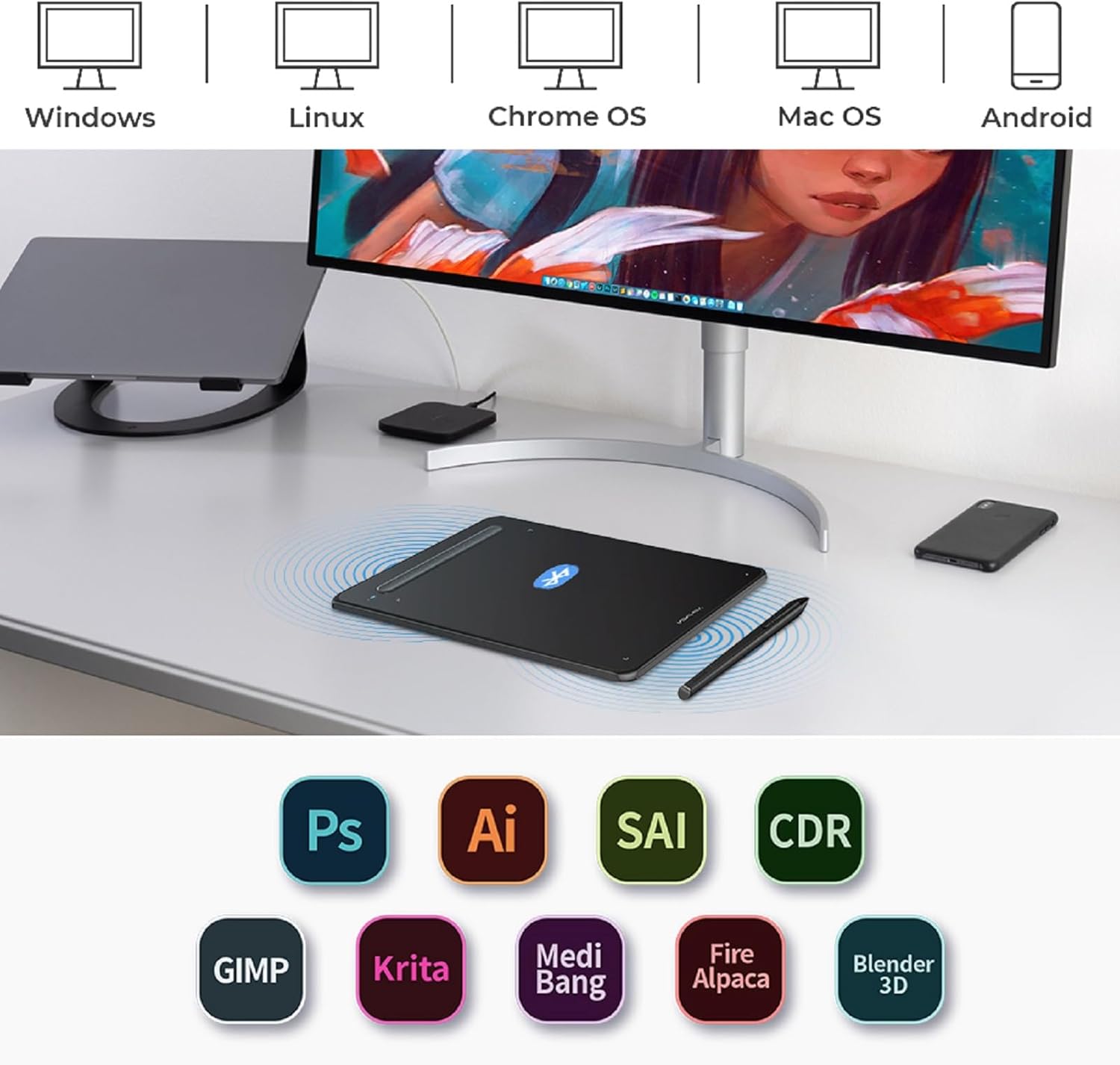 • Широка съвместимост: Рисоващата подложка Deco M е съвместима с Windows, Mac, Chrome, Linux, Android и работи с популярен софтуер за дигитално изкуство като Adobe Photoshop, Illustrator, SAI, CDR, GIMP, Krita, MediBang, FireAlpaca и Blender 3D.