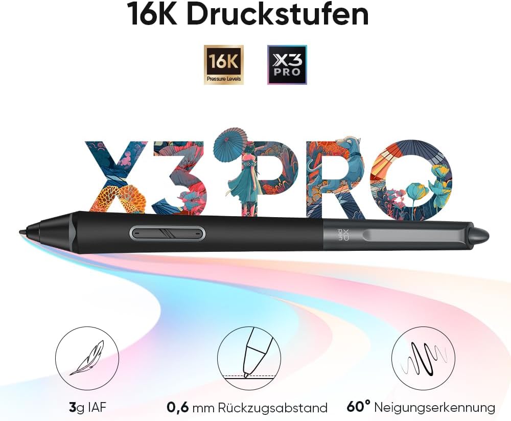 • X3 Pro Smart Chip, 16k нива на натиск: Наистина революционна иновация, X3 Pro Smart Chip Pen реагира на 16 384 (двойни 8 192) нива на натиск, за първи път в индустрията. Той е накланяем и открива под ъгъл до 60°.