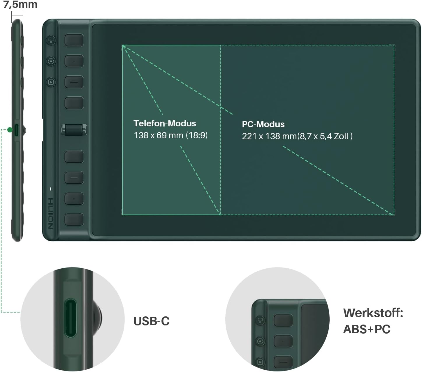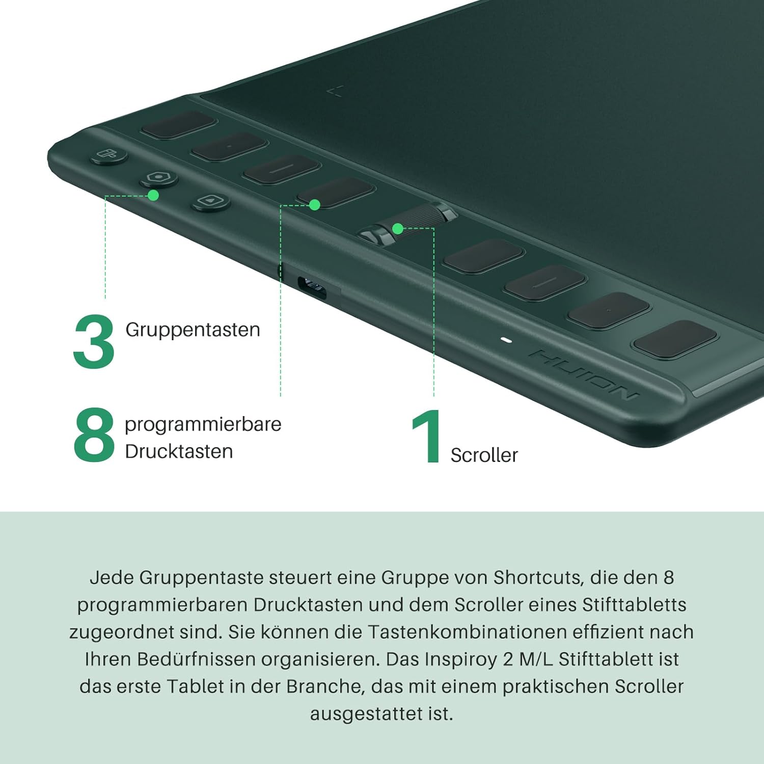 Графични таблети HUION Inspiroy 2M, преносим таблет за рисуване с 8192 нива на оцветяване, цифрова писалка без батерии, 8 бутона + скролер, за Windows Mac Linux Android ChromeOS (зелен)