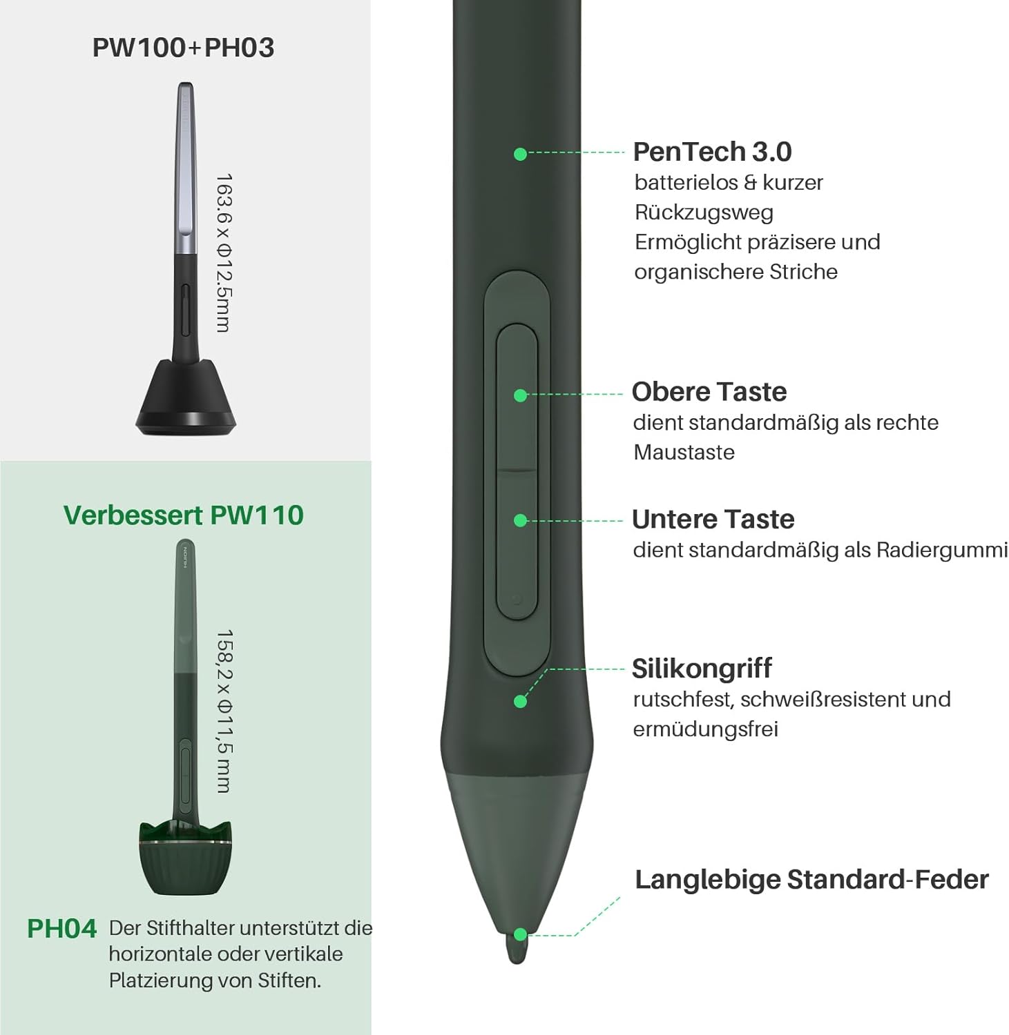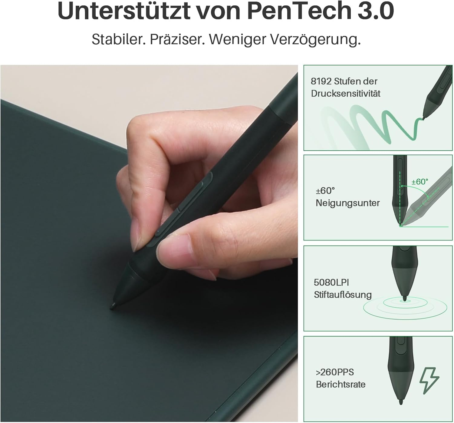 • Подобрен PenTech 3.0: Huion Inspiroy 2 M използва стандартна технология за писалка PenTech 3.0, с 40% намаление на разстоянието на прибиране, работа без батерии и функция за накланяне, по-скоро като истинска писалка. Силиконовият захват на PW110 е по-дълъг, натискането на клавишите е по-дълбоко, а писалката като цяло е по-тънка, което я прави удоволствие за държане.