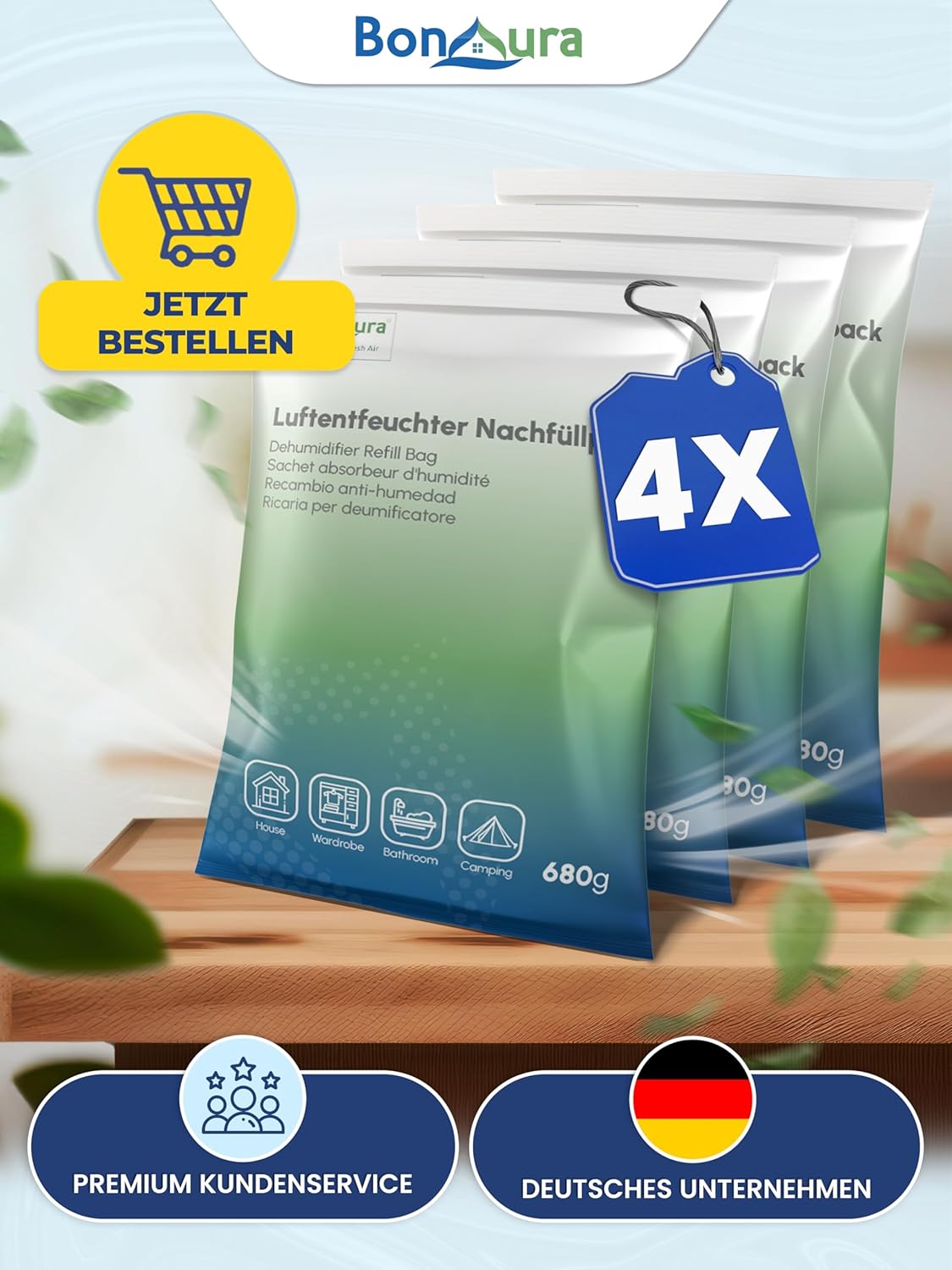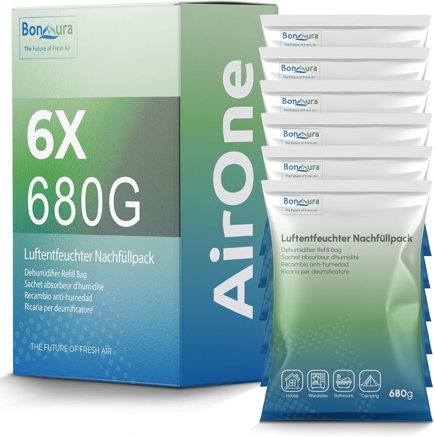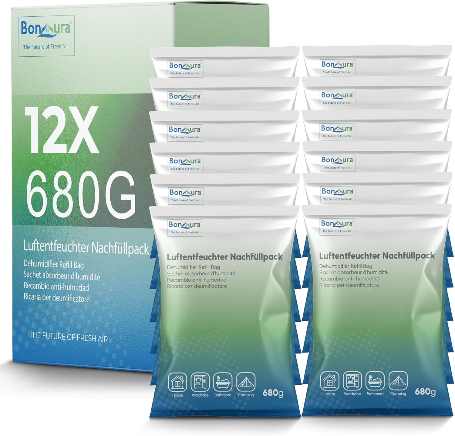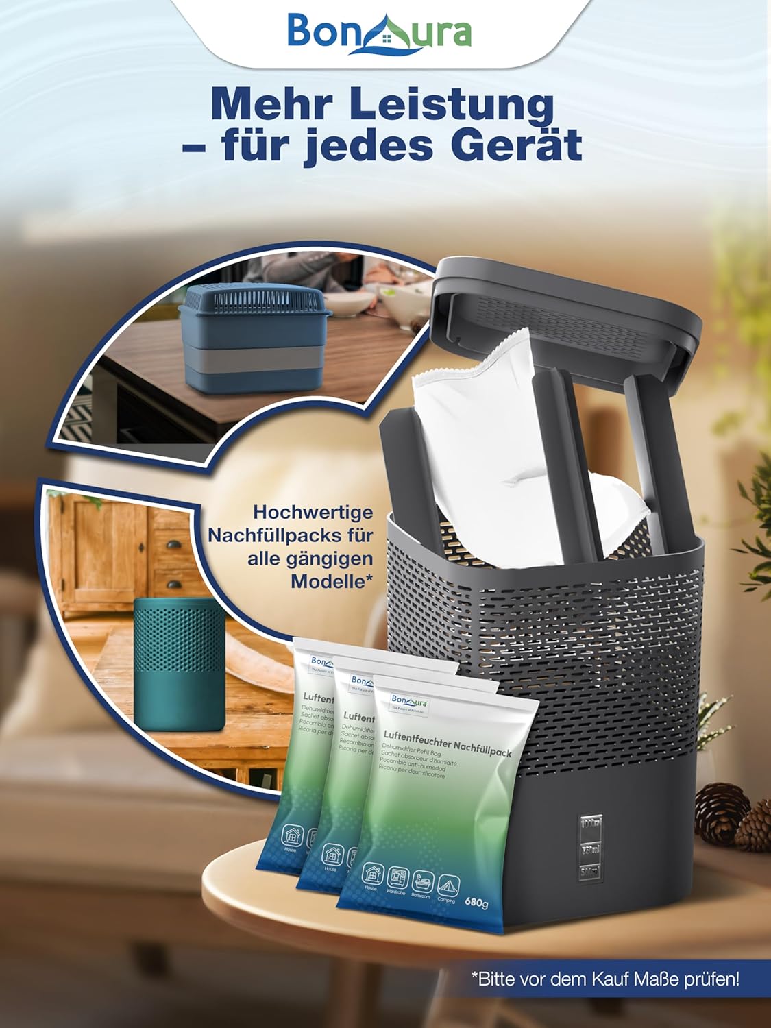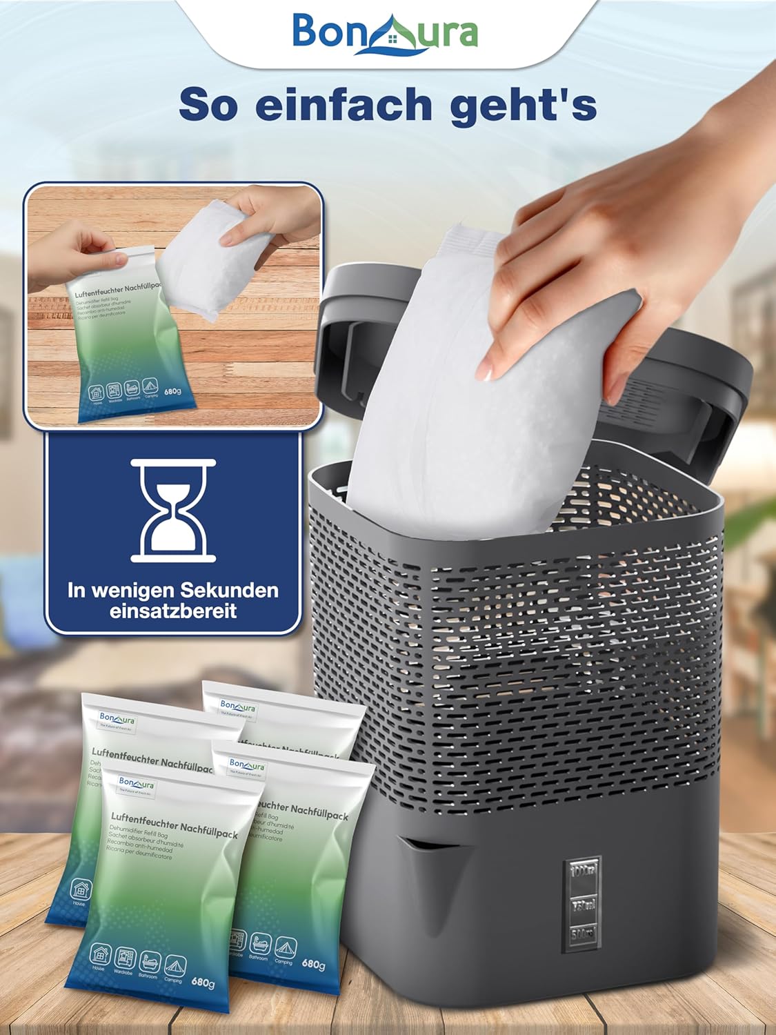 • Ефективен срещу влага: този влагоабсорбатор BonAura е ефективен убиец на влага и ви помага оптимално при петна от мухъл, застояли миризми и конденз по прозорците.