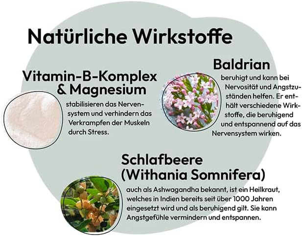 Малтодекстрин, целулоза, мая, нишесте (картофи), ашваганда (Withania somnifera), валериана, лупина, розмарин, трикалциев фосфат, магнезиев стеарат, натриев гликолат, силициев диоксид