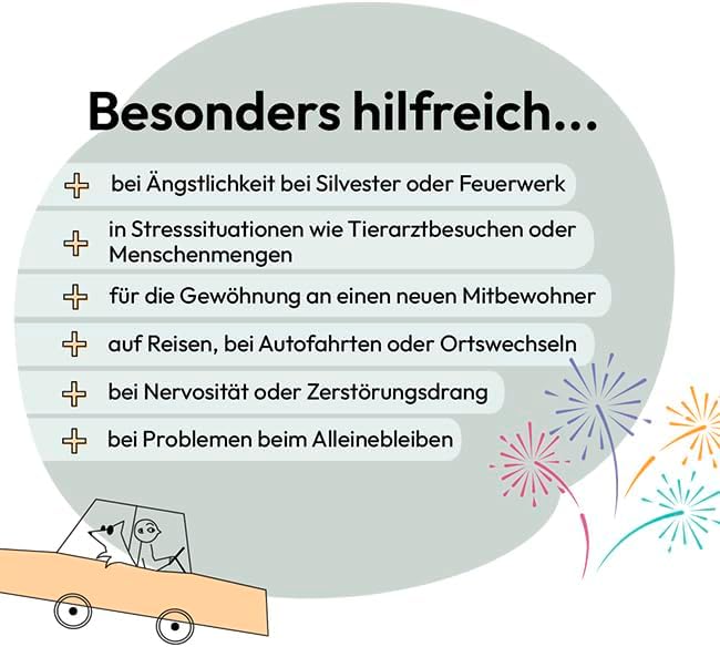Една таблетка на 5 кг телесно тегло на вашето куче дневно. В идеалния случай започнете да приемате приблизително 5 дни преди очакваното събитие, като например Нова година, пътуване или посещение при ветеринарен лекар. Моля, съхранявайте таблетките за стрес на хладно и сухо място, недостъпно за деца.