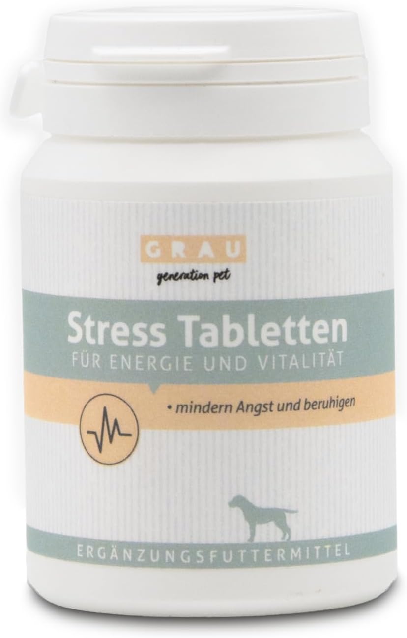 Стрес таблетките на GRAU помагат на вашето куче да се отпусне по естествен път. Те могат да бъдат полезни в следните ситуации: стресови ситуации като посещения при ветеринарен лекар или тълпи, пътуване, каране на кола или смяна на местоположението, нервност, деструктивни тенденции и тревожност от раздяла, страх от Нова година и фойерверки или свикване с нов съквартирант. Стрес таблетките GRAU… - намаляват тревожността и осигуряват краткосрочна релаксация благодарение на ашваганда (Withania somnifera) - осигуряват дългосрочна релаксация благодарение на валериана - стабилизират нервната система с витамин B комплекс - предотвратяват мускулни крампи, причинени от стрес, с магнезий - успокояват, без да причиняват сънливост и не са пристрастяващи - могат да се използват дългосрочно. Състав: Малтодекстрин, целулоза, мая, нишесте (картофено), ашваганда (Withania somnifera), валериана, лупина, розмарин, трикалциев фосфат, магнезиев стеарат, натриев гликолат, силициев диоксид. Аналитични съставки: Суров протеин 3,8%, съдържание на мазнини 1,7%, сурови фибри 6,8%, сурова пепел 21,0%, влага 3,5%, калций 1,8%, фосфор 1,0%, магнезий 7,5%, натрий 0,01%. Хранителни добавки: Витамин B6 166 mg (110 µg), фолиева киселина 30 mg (20 µg) · Технологични добавки: Антиоксиданти с екстракти от естествен произход, богати на токоферол (естествен витамин E).