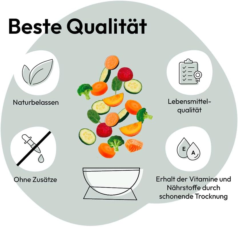Ето как: Накиснете част от нашите сухи BARF продукти с две части вода за приблизително 10-20 минути или докато достигнете желаната консистенция. Просто отцедете излишната вода. Смесете накиснатите сушени зеленчуци с нашите Pur консерви или сурово месо по ваш избор. Комбинирайте с нашите BARF добавки, за да създадете балансирано хранене. Полезно е да знаете: 1 г сушени зеленчуци е еквивалентен на приблизително 10 г пресни зеленчуци.