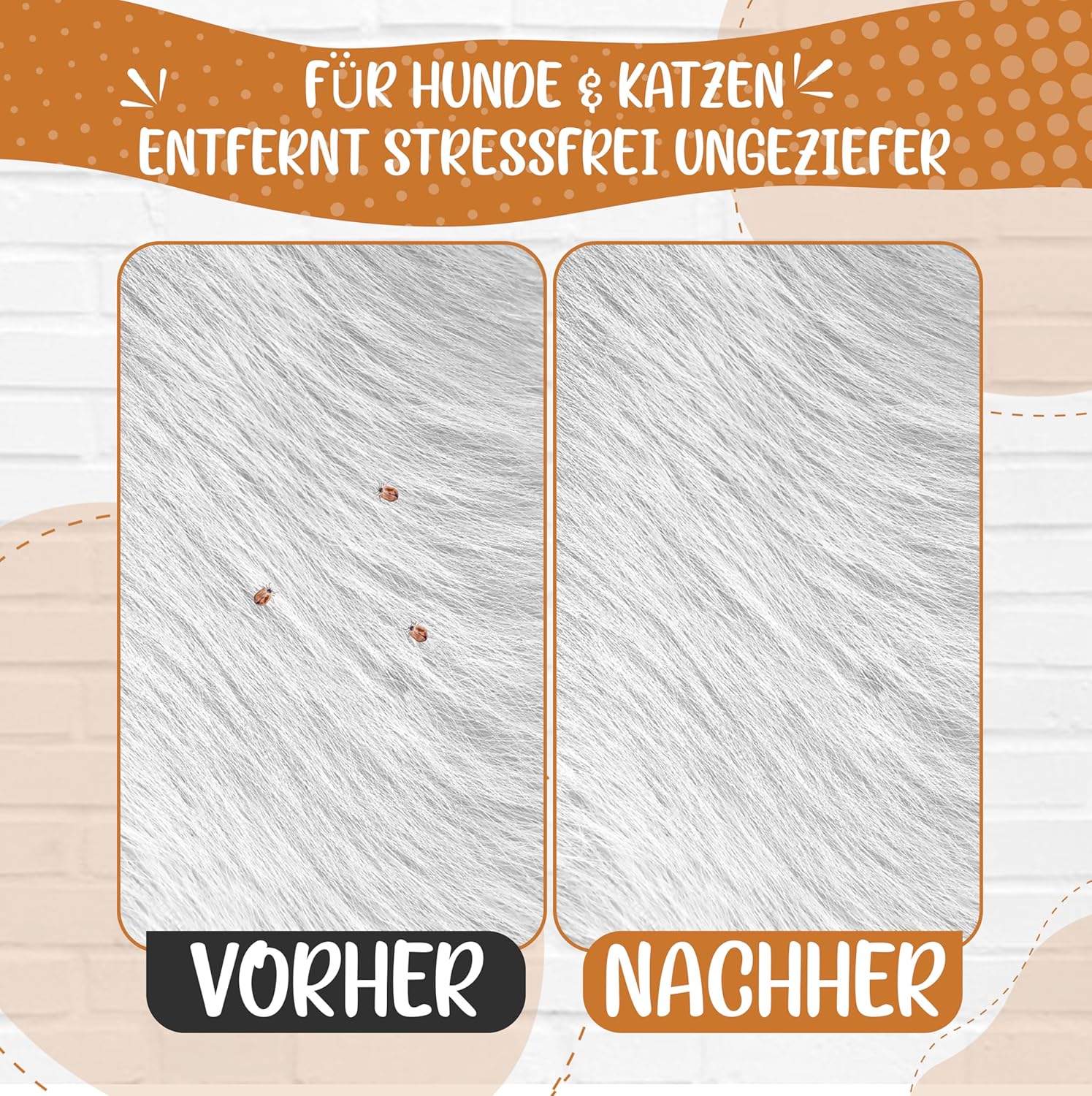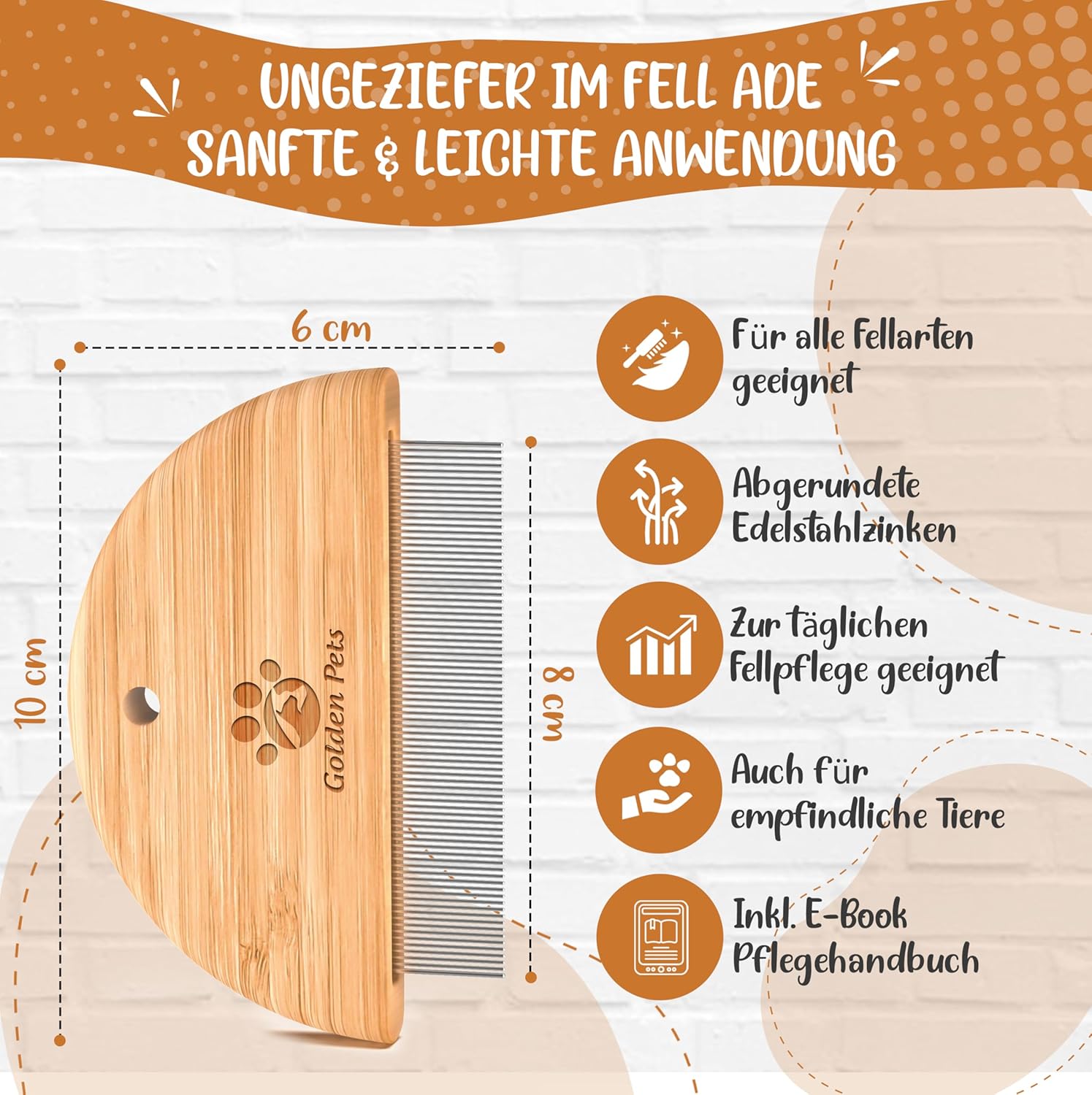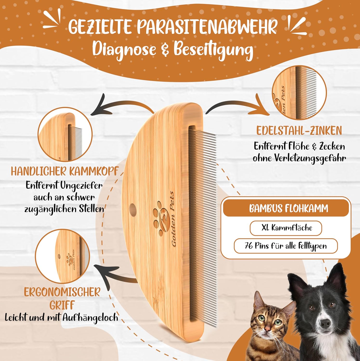 За най-добри резултати използвайте гребена след нанасяне на шампоан против бълхи, препарат против бълхи или спрей против бълхи. Гребенът е подходящ за кучета и котки с всякаква дължина на козината. Моля, обърнете внимание, че гребенът има 68 близко разположени, въртящи се, специално заоблени зъба от неръждаема стомана. Използвайте гребена, като работите от върховете на косъма нагоре, за да разплетете косъма и да премахнете паразитите.