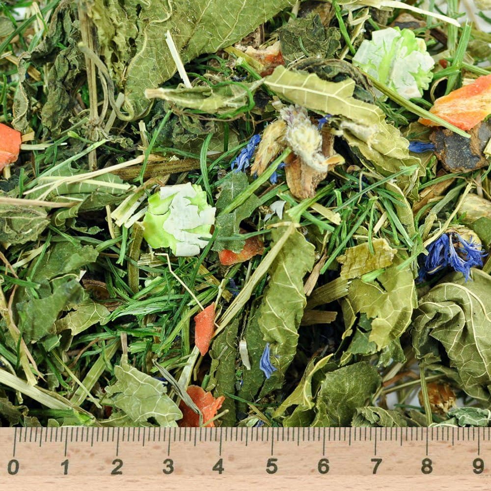 Ливадни билки и треви*, магданоз, грахови люспи, студено пресовани ленени люспи, моркови, листа от черница, листа от коприва, люцерна, метличина, пащърнак, дъбова кора, корен от глухарче, розмарин, копър, корен от женско биле, корен от ружа, студено пресовано ленено масло, листа от върба, червена детелина *Овощна трева, ливадна лисича опашка, ливадна власатка, червена власатка, овча власатка, мека мека трева, червена детелина, теменужка живовляк, широколистен живовляк, обикновен фий, гребенест кучешки опашка, кентъки блуграс, алсике детелина, обикновен бял равнец, кимион, краве магданоз, еньовче, голяма разваленка, едногодишна блуграс, тимотейка, тръстикова трева, тинтява, червена власатка, ливаден градински чай, див морков, бяла детелина